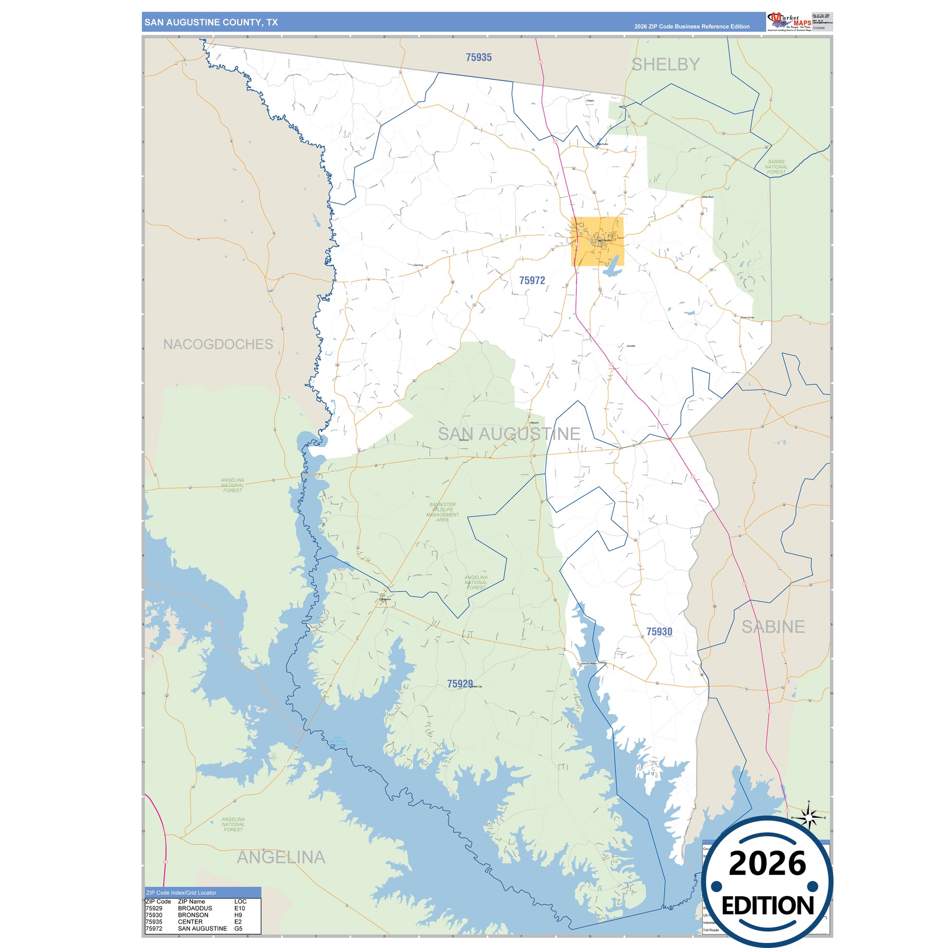 The Business Reference Style San Augustine County, TX is a detailed map that includes all towns, cities, major roadways, and highways. Available in multiple wall map sizes, perfect for home, school, office, or business display.