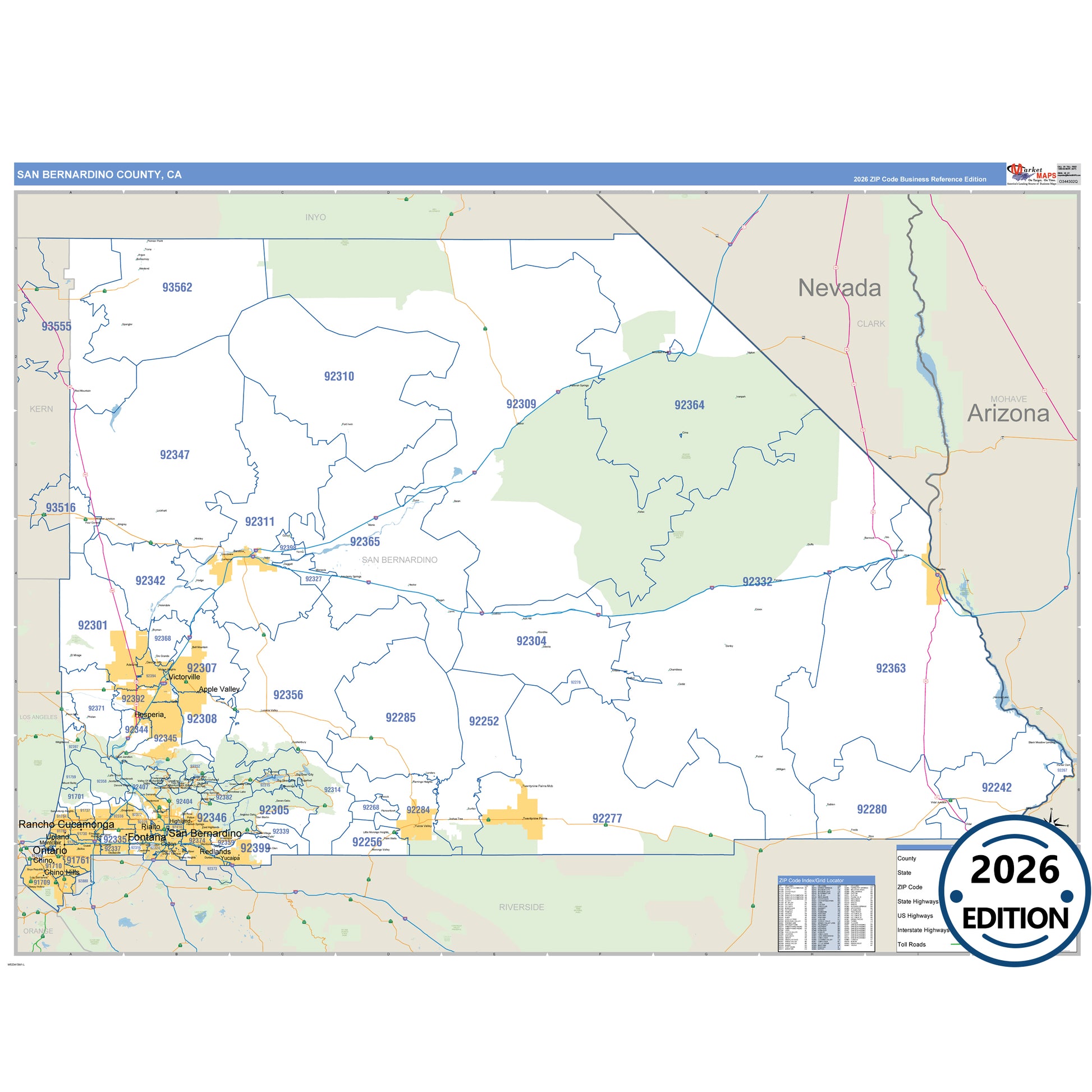 The Business Reference Style San Bernardino County, CA is a detailed map that includes all towns, cities, major roadways, and highways. Available in multiple wall map sizes, perfect for home, school, office, or business display.