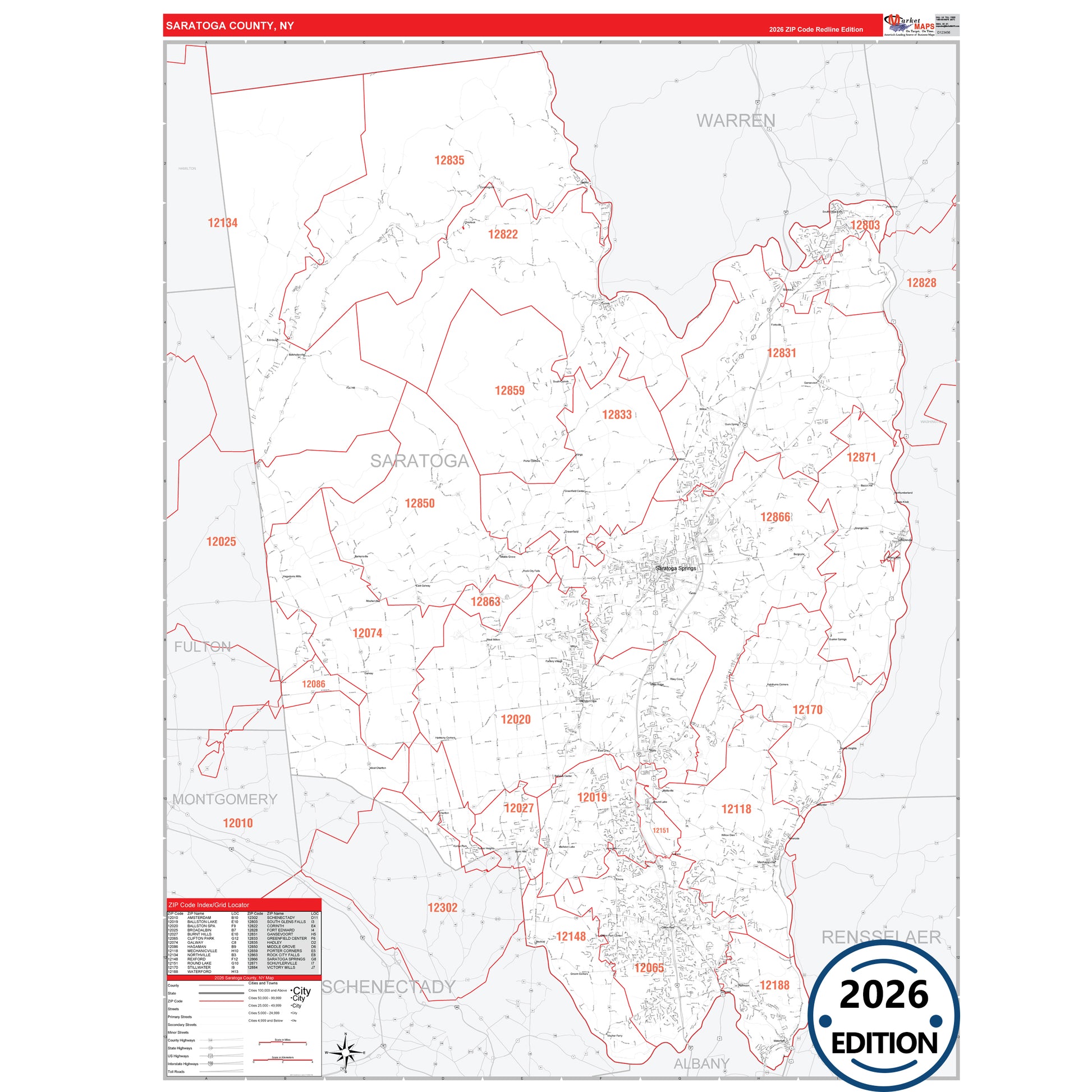 The RedLine Style map of Saratoga County, NY shows ZIP code areas overlaid on a detailed road network of Saratoga County, New York. Ideal for drawing locations, territories, and other applications. Base map features include all major streets and highways labeled, cities and towns, county and state boundaries, neighborhood names, railroads, and a clean white background suitable for marking and planning.