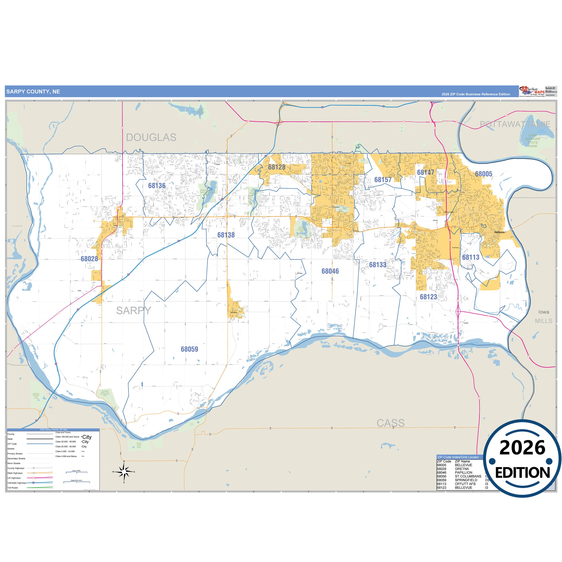 The Business Reference Style Sarpy County, NE is a detailed map that includes all towns, cities, major roadways, and highways. Available in multiple wall map sizes, perfect for home, school, office, or business display.