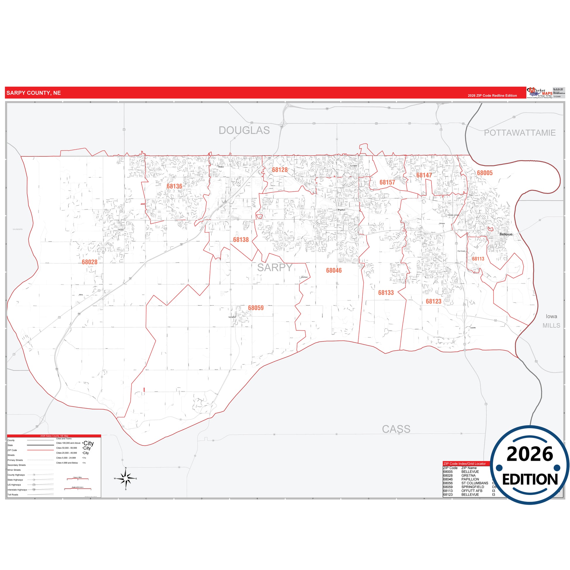 The RedLine Style map of Sarpy County, NE shows ZIP code areas overlaid on a detailed road network of Sarpy County, Nebraska. Ideal for drawing locations, territories, and other applications. Base map features include all major streets and highways labeled, cities and towns, county and state boundaries, neighborhood names, railroads, and a clean white background suitable for marking and planning.