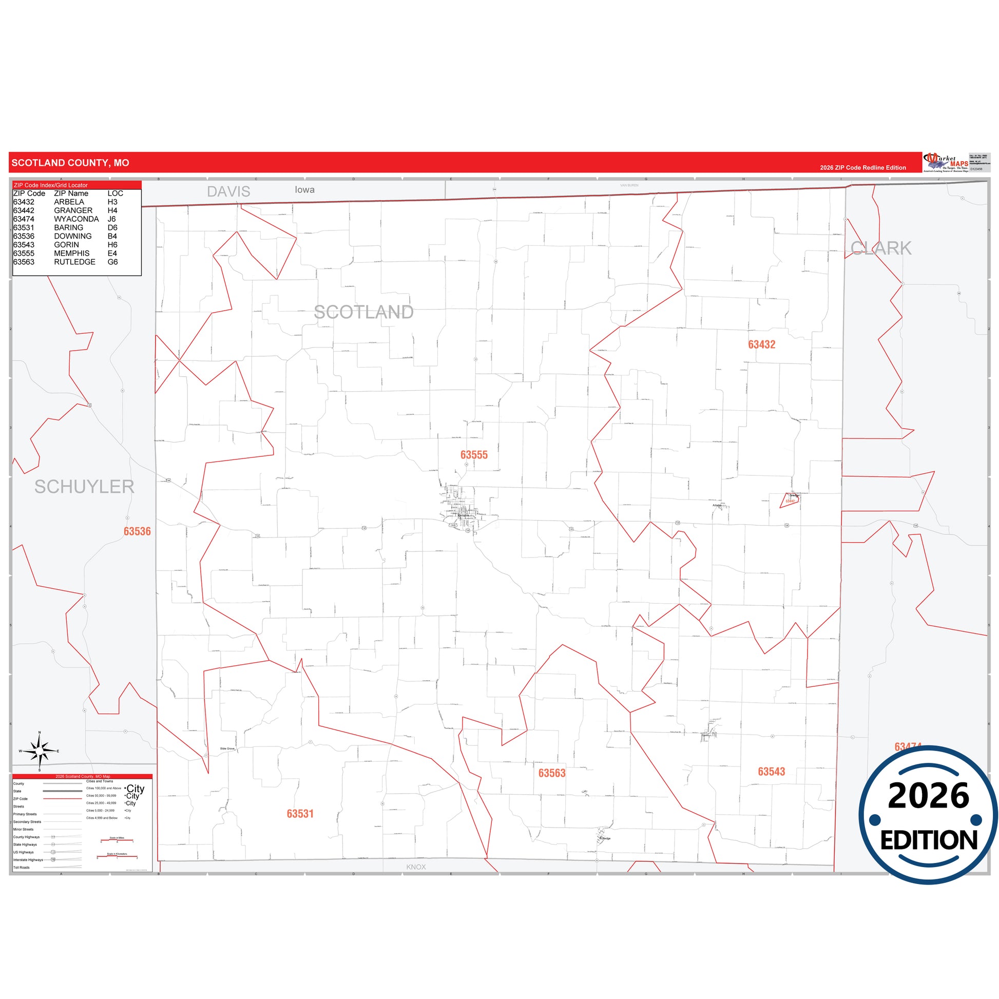 The RedLine Style map of Scotland County, MO shows ZIP code areas overlaid on a detailed road network of Scotland County, Missouri. Ideal for drawing locations, territories, and other applications. Base map features include all major streets and highways labeled, cities and towns, county and state boundaries, neighborhood names, railroads, and a clean white background suitable for marking and planning.