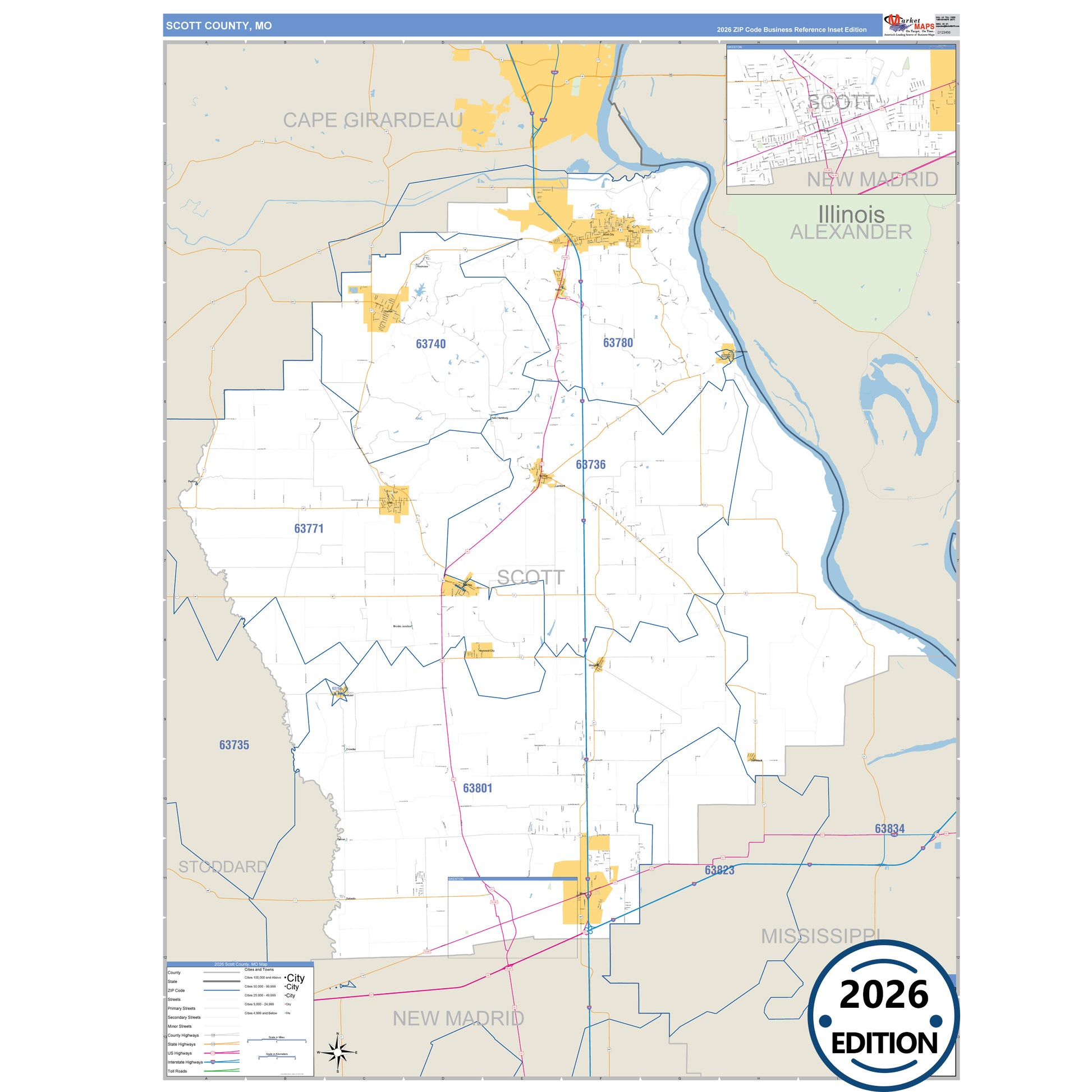 The Business Reference Style Scott County, MO is a detailed map that includes all towns, cities, major roadways, and highways. Available in multiple wall map sizes, perfect for home, school, office, or business display.