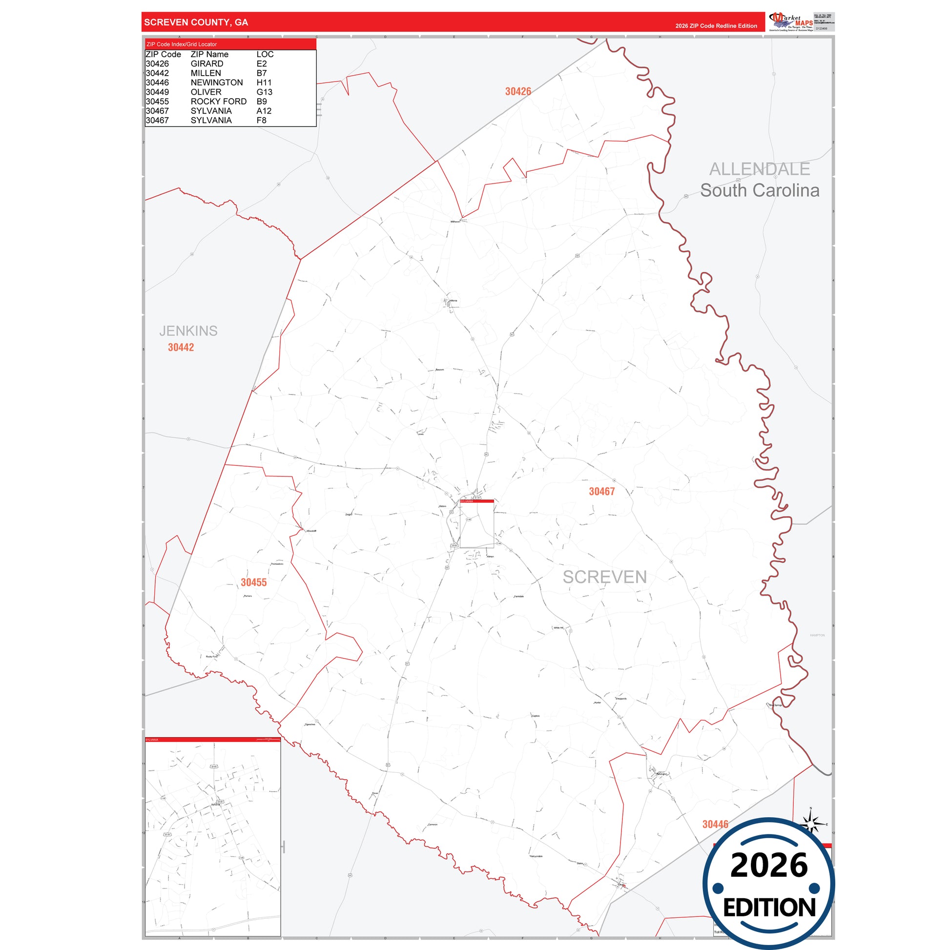 The RedLine Style map of Screven County, GA shows ZIP code areas overlaid on a detailed road network of Screven County, Georgia. Ideal for drawing locations, territories, and other applications. Base map features include all major streets and highways labeled, cities and towns, county and state boundaries, neighborhood names, railroads, and a clean white background suitable for marking and planning.