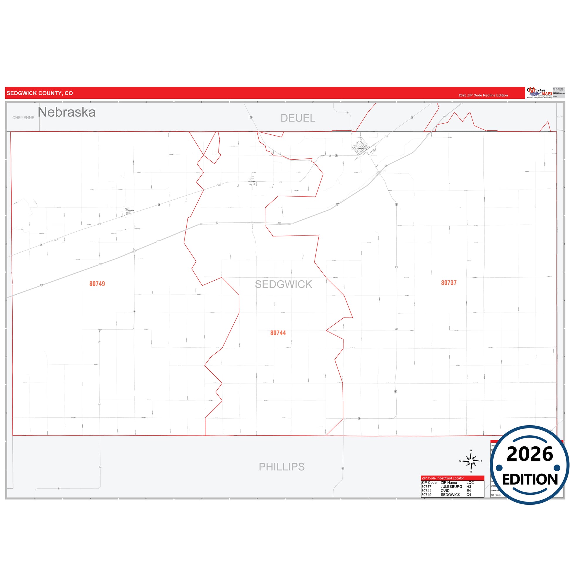 The RedLine Style map of Sedgwick County, CO shows ZIP code areas overlaid on a detailed road network of Sedgwick County, Colorado. Ideal for drawing locations, territories, and other applications. Base map features include all major streets and highways labeled, cities and towns, county and state boundaries, neighborhood names, railroads, and a clean white background suitable for marking and planning.