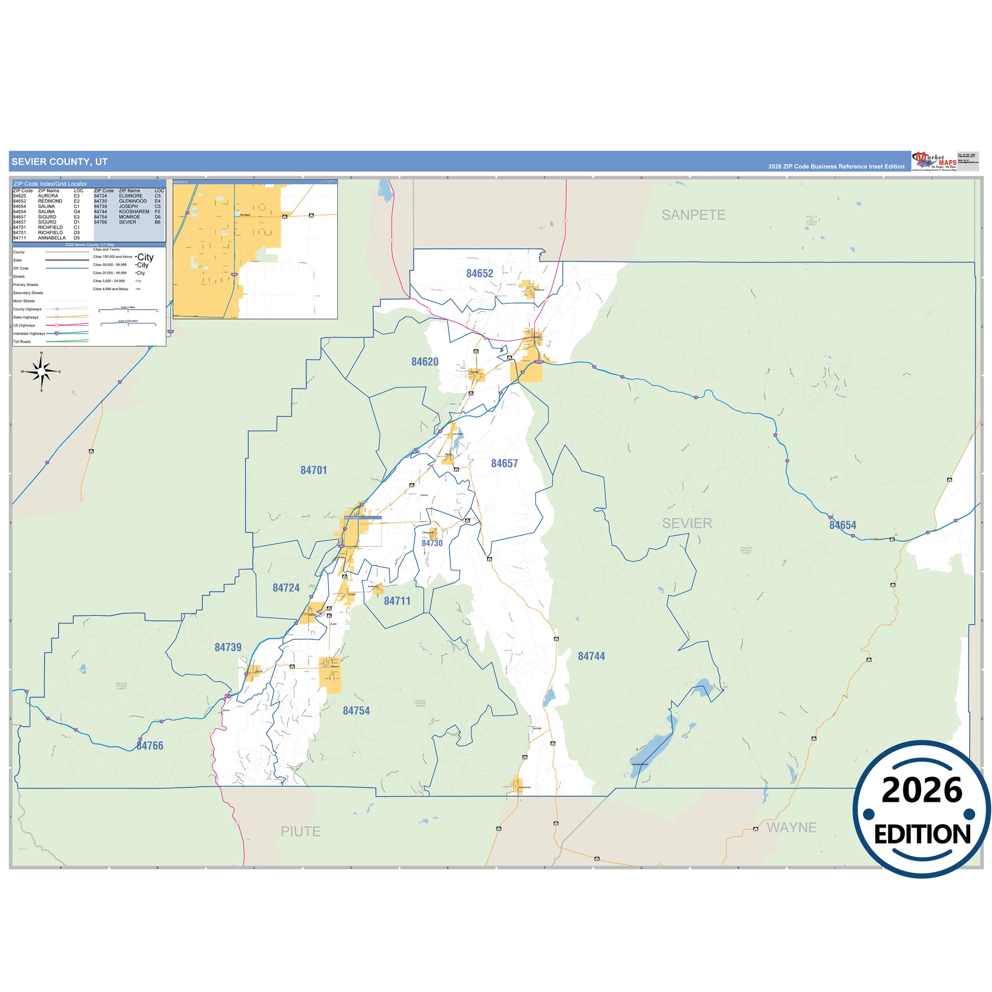 The Business Reference Style Sevier County, UT is a detailed map that includes all towns, cities, major roadways, and highways. Available in multiple wall map sizes, perfect for home, school, office, or business display.