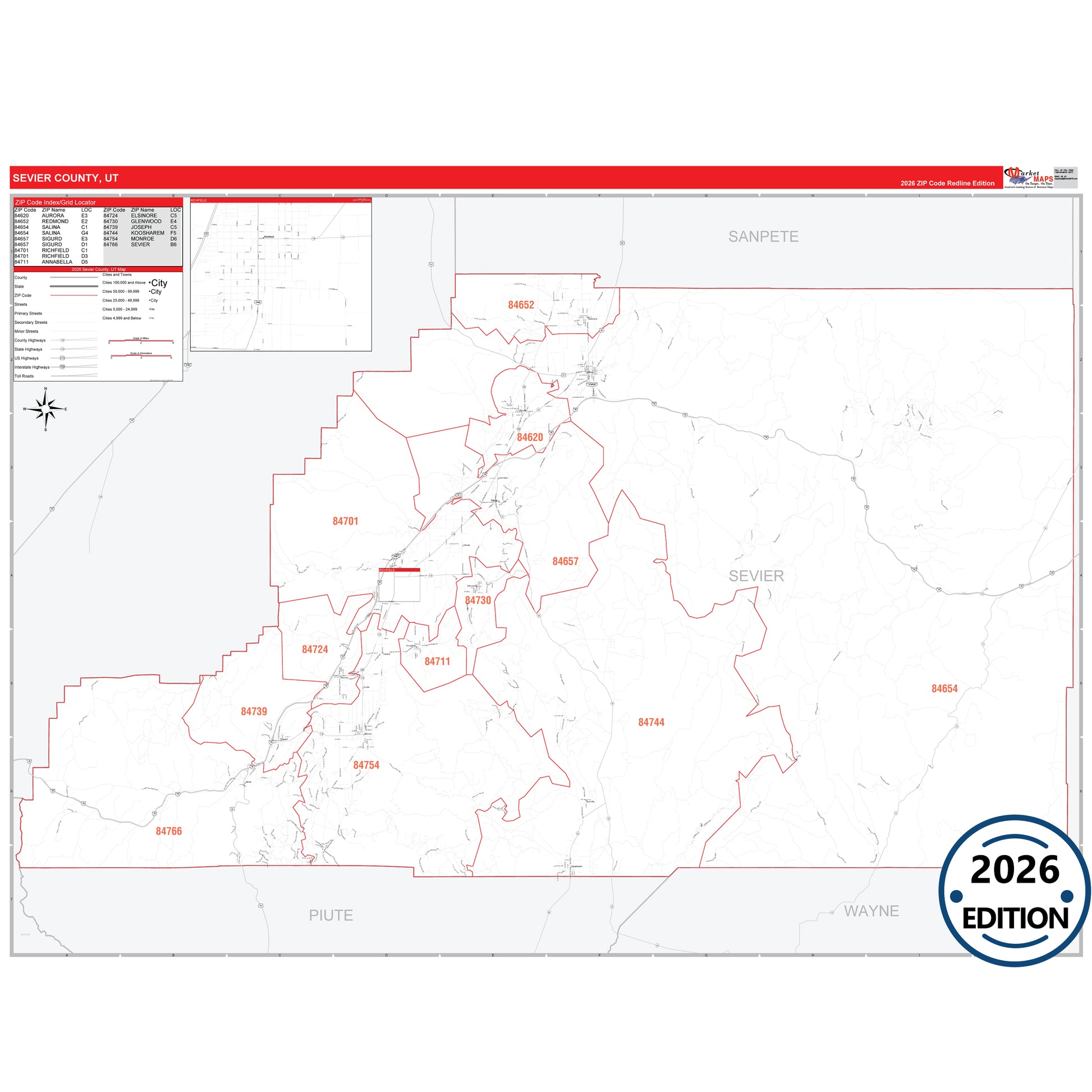 The RedLine Style map of Sevier County, UT shows ZIP code areas overlaid on a detailed road network of Sevier County, Utah. Ideal for drawing locations, territories, and other applications. Base map features include all major streets and highways labeled, cities and towns, county and state boundaries, neighborhood names, railroads, and a clean white background suitable for marking and planning.