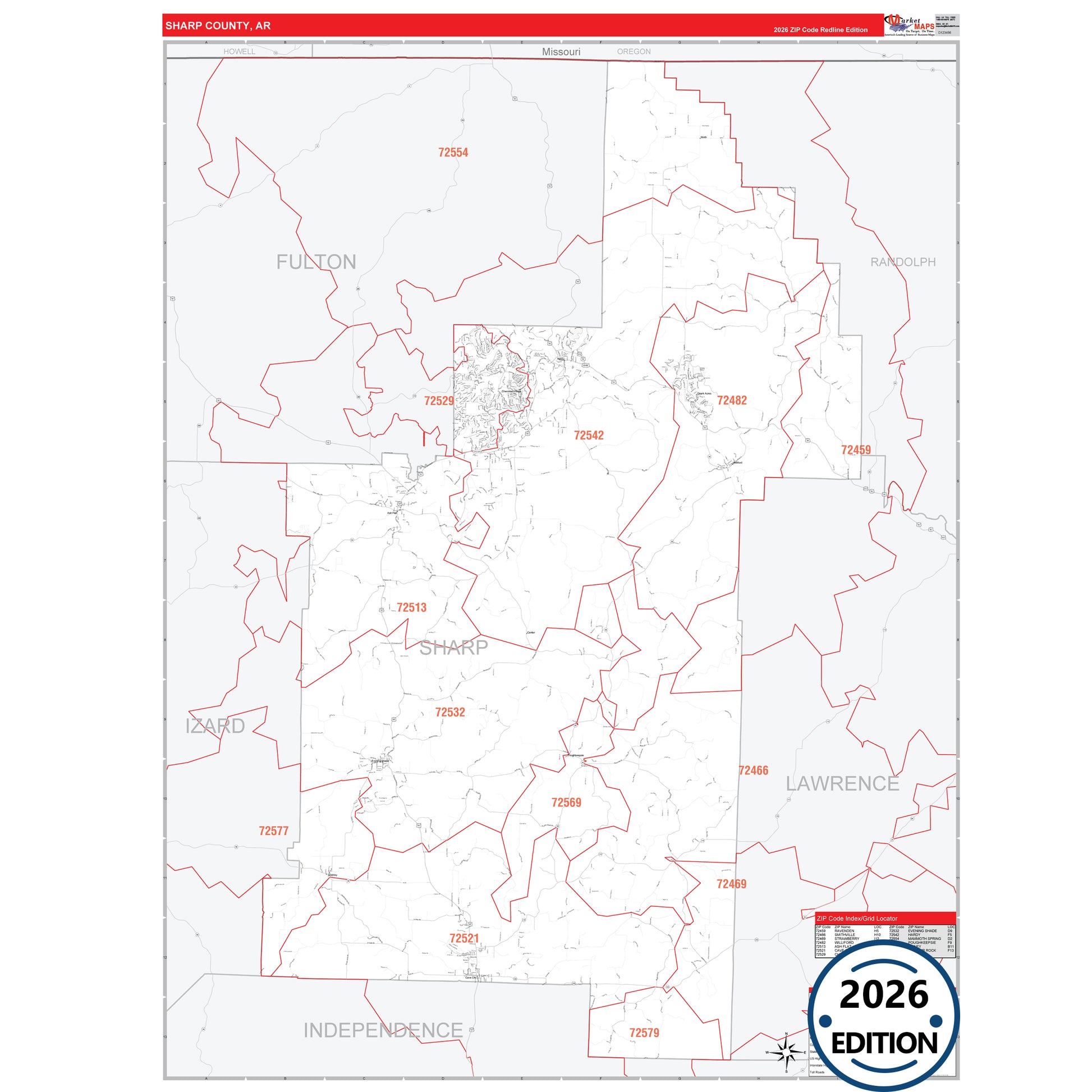 The RedLine Style map of Sharp County, AR shows ZIP code areas overlaid on a detailed road network of Sharp County, Arkansas. Ideal for drawing locations, territories, and other applications. Base map features include all major streets and highways labeled, cities and towns, county and state boundaries, neighborhood names, railroads, and a clean white background suitable for marking and planning.
