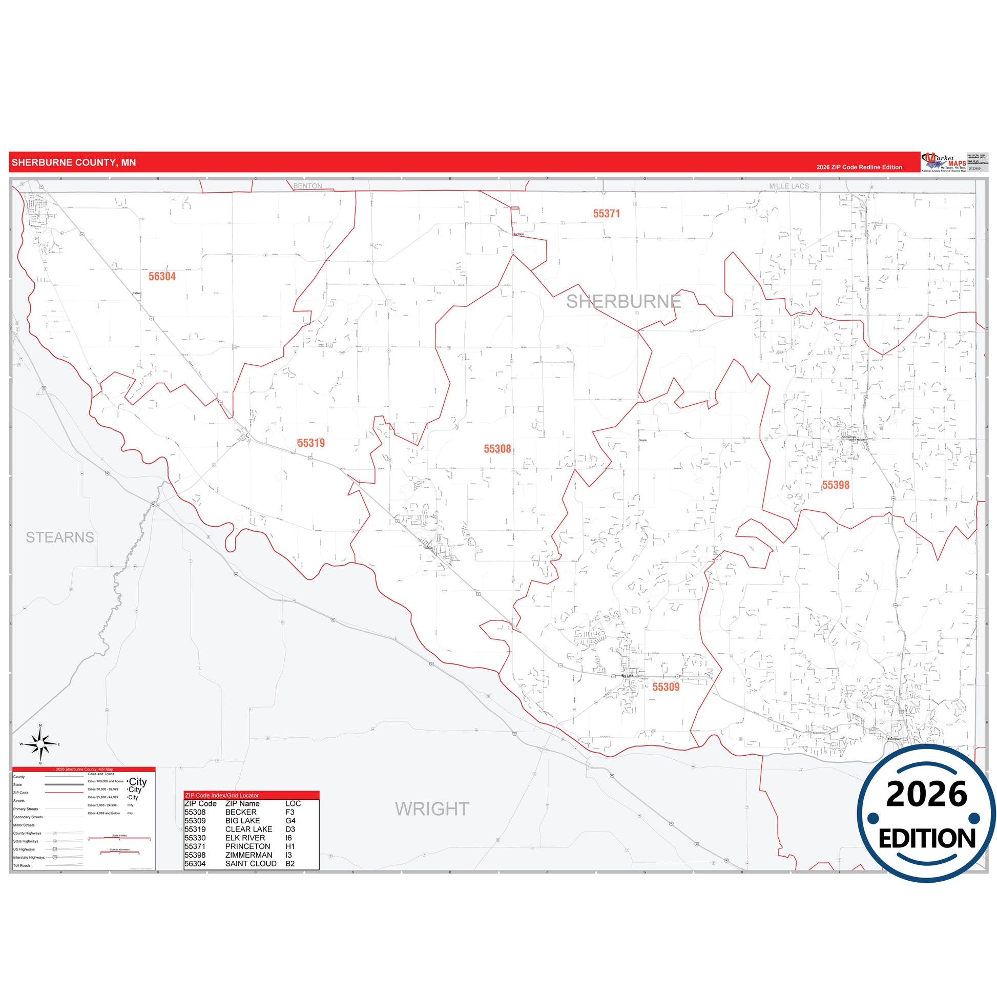 The RedLine Style map of Sherburne County, MN shows ZIP code areas overlaid on a detailed road network of Sherburne County, Minnesota. Ideal for drawing locations, territories, and other applications. Base map features include all major streets and highways labeled, cities and towns, county and state boundaries, neighborhood names, railroads, and a clean white background suitable for marking and planning.