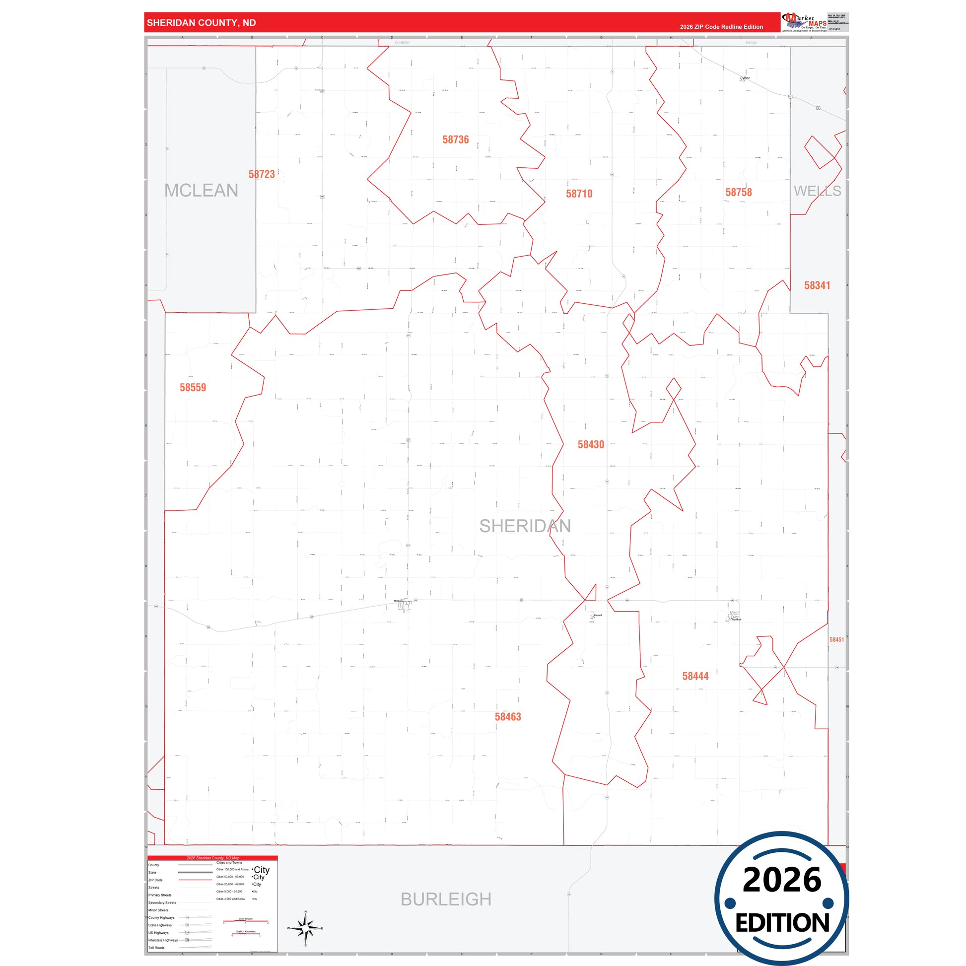The RedLine Style map of Sheridan County, ND shows ZIP code areas overlaid on a detailed road network of Sheridan County, North Dakota. Ideal for drawing locations, territories, and other applications. Base map features include all major streets and highways labeled, cities and towns, county and state boundaries, neighborhood names, railroads, and a clean white background suitable for marking and planning.