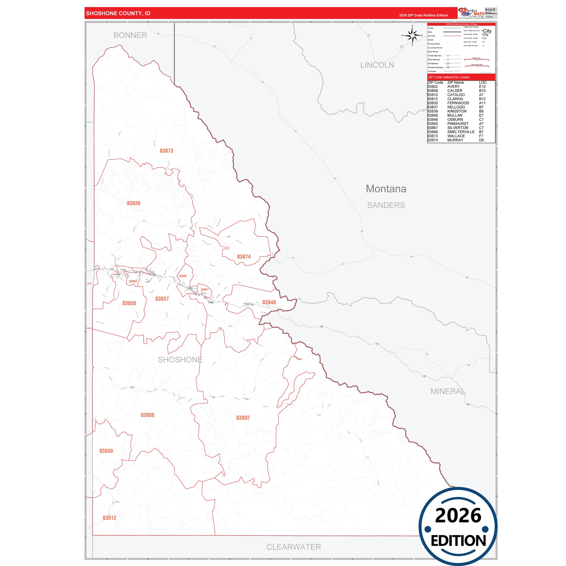 The RedLine Style map of Shoshone County, ID shows ZIP code areas overlaid on a detailed road network of Shoshone County, Idaho. Ideal for drawing locations, territories, and other applications. Base map features include all major streets and highways labeled, cities and towns, county and state boundaries, neighborhood names, railroads, and a clean white background suitable for marking and planning.