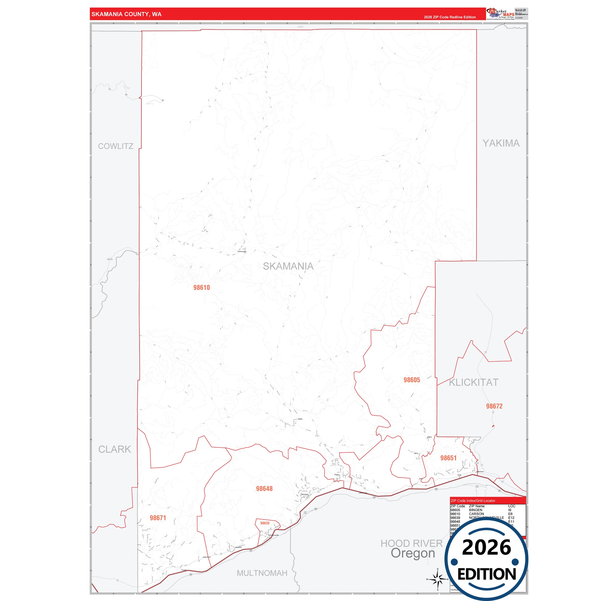 The RedLine Style map of Skamania County, WA shows ZIP code areas overlaid on a detailed road network of Skamania County, Washington. Ideal for drawing locations, territories, and other applications. Base map features include all major streets and highways labeled, cities and towns, county and state boundaries, neighborhood names, railroads, and a clean white background suitable for marking and planning.