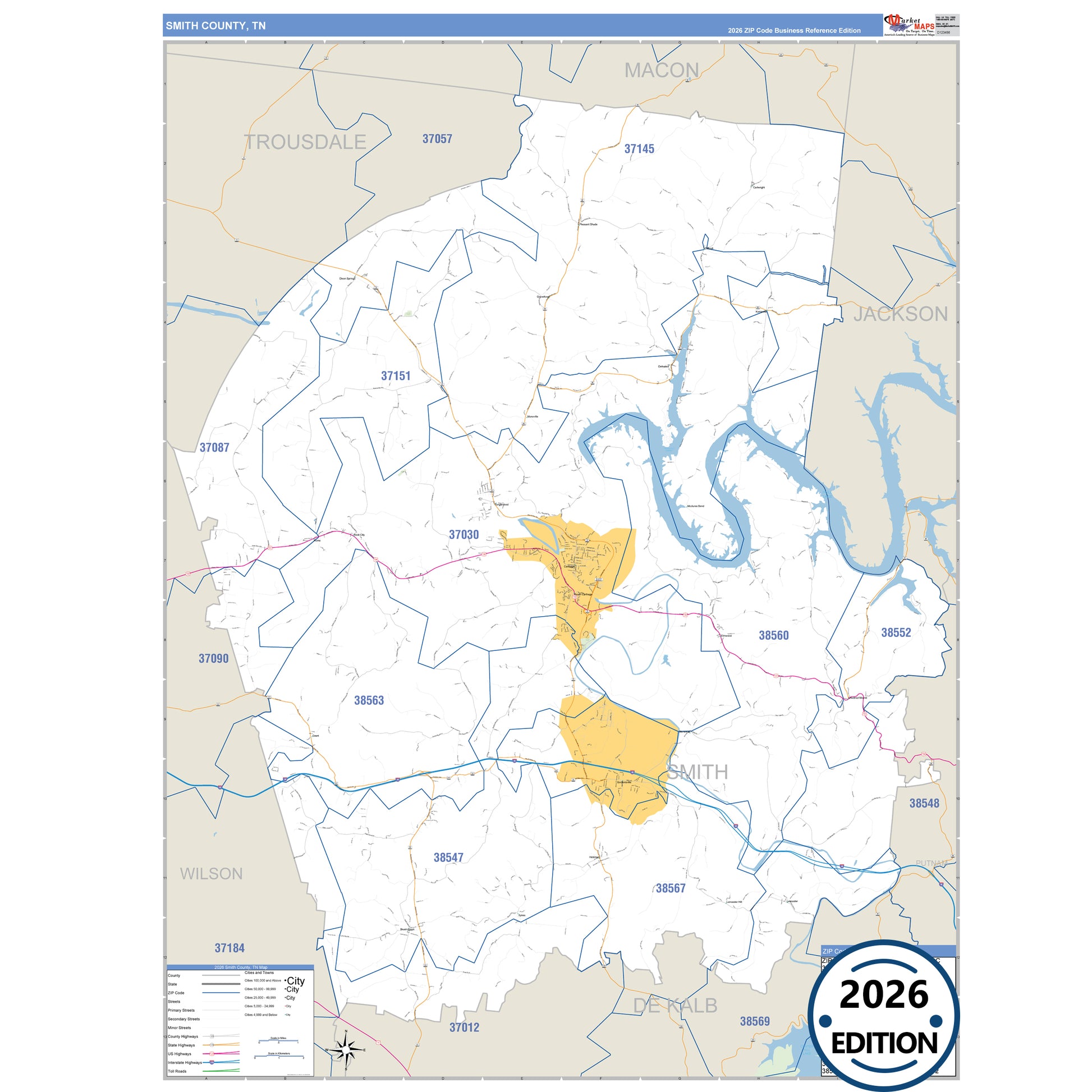 The Business Reference Style Smith County, TN is a detailed map that includes all towns, cities, major roadways, and highways. Available in multiple wall map sizes, perfect for home, school, office, or business display.