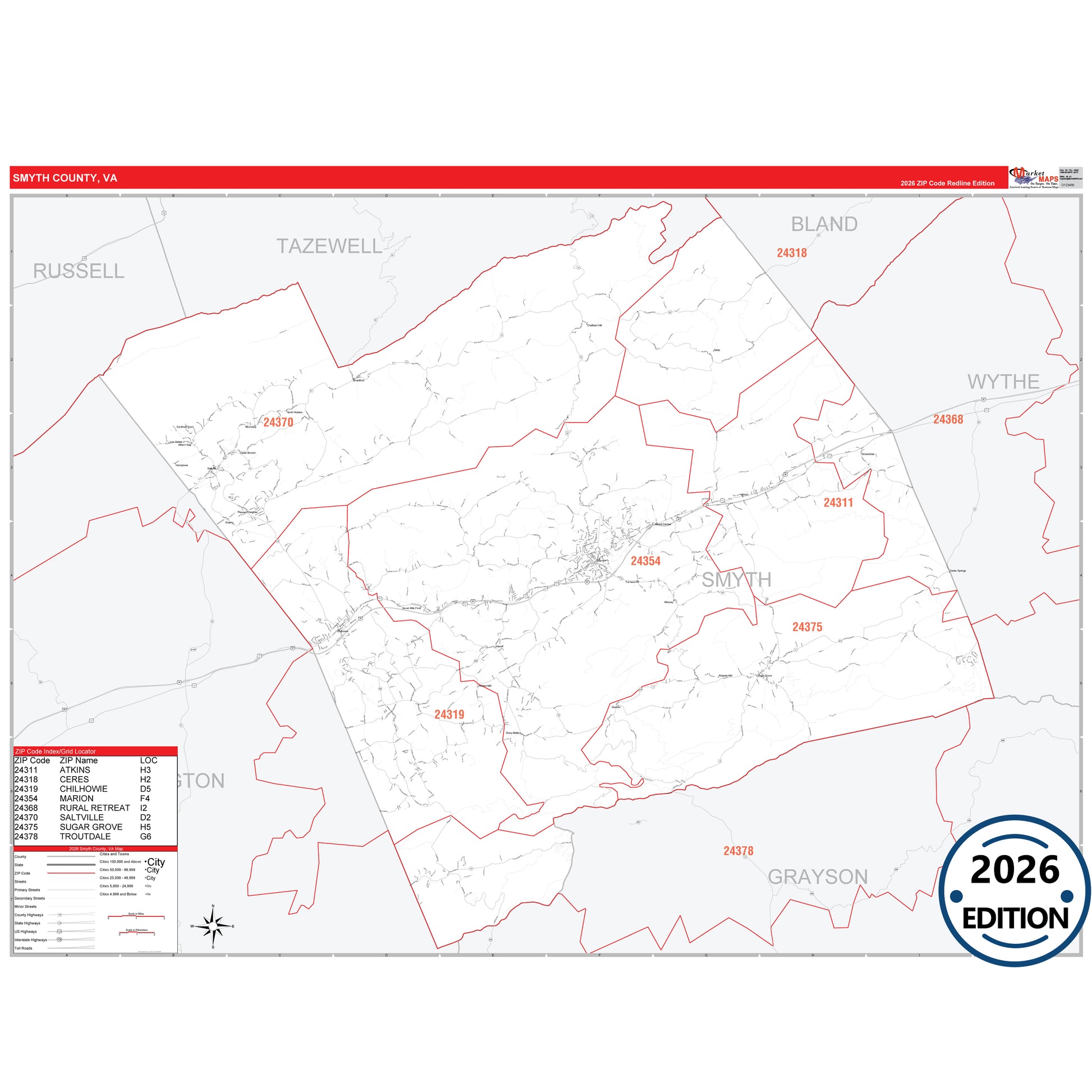 The RedLine Style map of Smyth County, VA shows ZIP code areas overlaid on a detailed road network of Smyth County, Virginia. Ideal for drawing locations, territories, and other applications. Base map features include all major streets and highways labeled, cities and towns, county and state boundaries, neighborhood names, railroads, and a clean white background suitable for marking and planning.