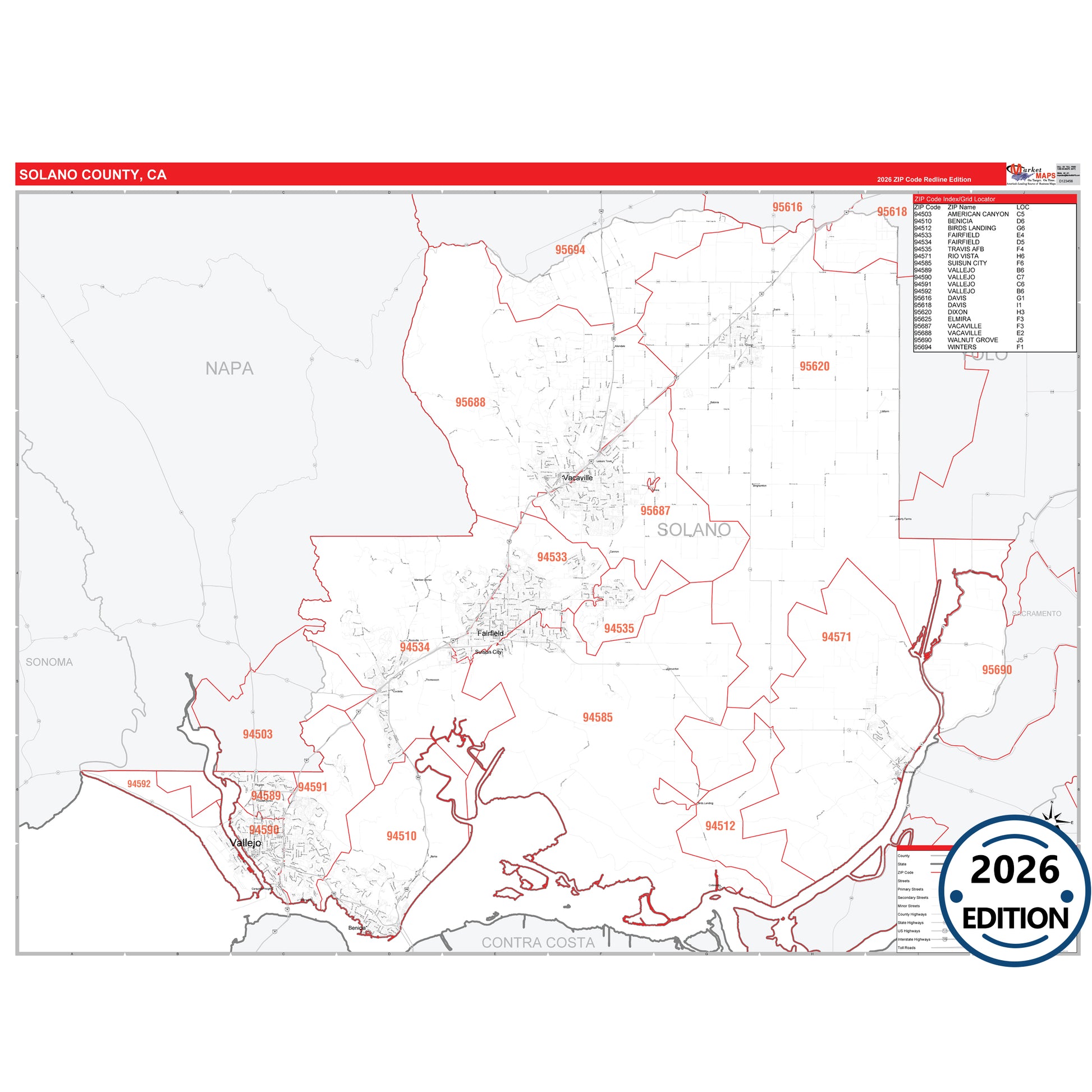 The RedLine Style map of Solano County, CA shows ZIP code areas overlaid on a detailed road network of Solano County, California. Ideal for drawing locations, territories, and other applications. Base map features include all major streets and highways labeled, cities and towns, county and state boundaries, neighborhood names, railroads, and a clean white background suitable for marking and planning.