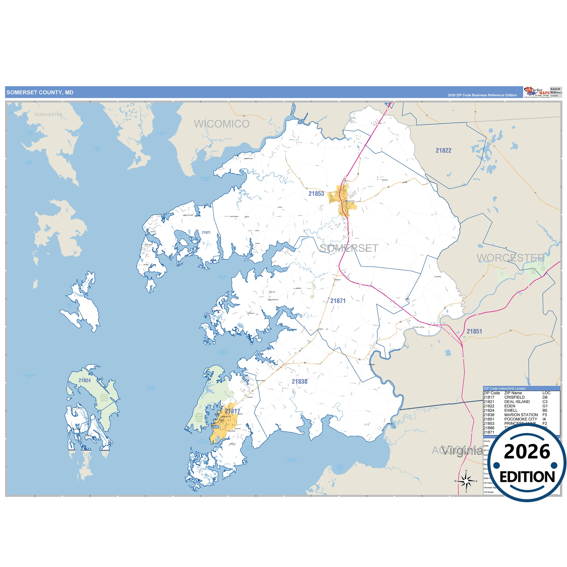 The Business Reference Style Somerset County, MD is a detailed map that includes all towns, cities, major roadways, and highways. Available in multiple wall map sizes, perfect for home, school, office, or business display.