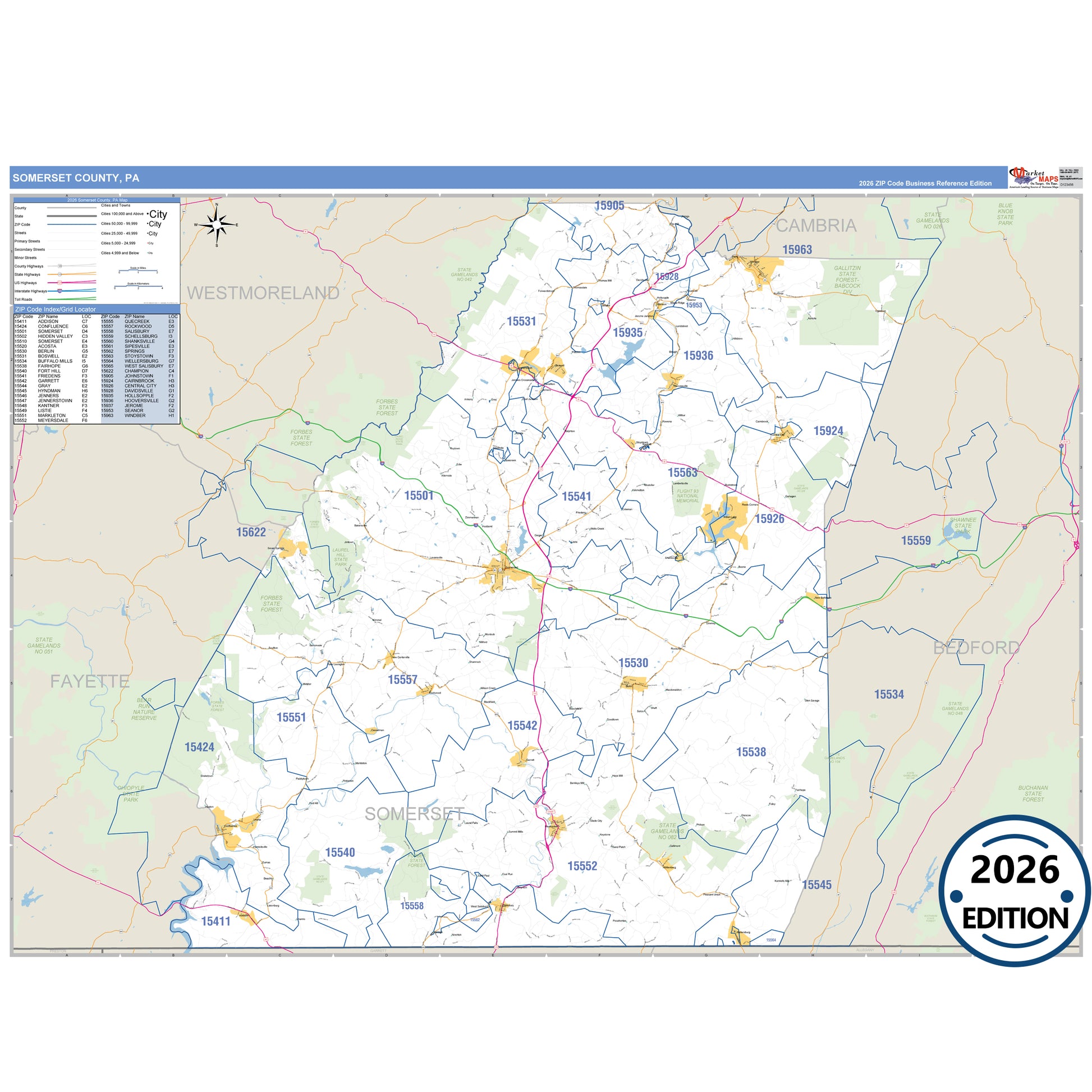 The Business Reference Style Somerset County, PA is a detailed map that includes all towns, cities, major roadways, and highways. Available in multiple wall map sizes, perfect for home, school, office, or business display.