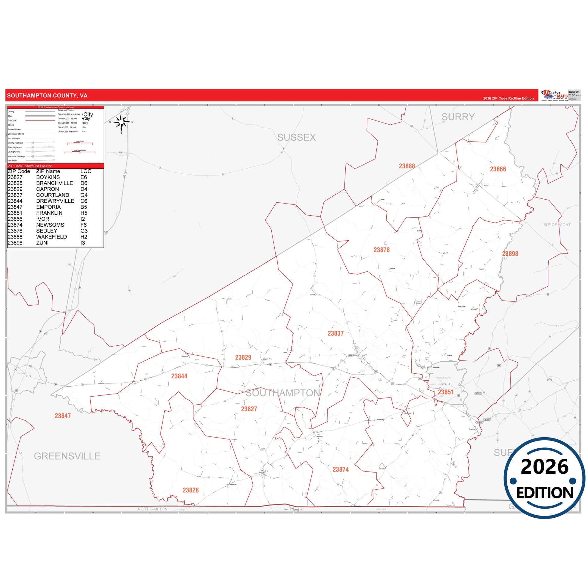 The RedLine Style map of Southampton County, VA shows ZIP code areas overlaid on a detailed road network of Southampton County, Virginia. Ideal for drawing locations, territories, and other applications. Base map features include all major streets and highways labeled, cities and towns, county and state boundaries, neighborhood names, railroads, and a clean white background suitable for marking and planning.