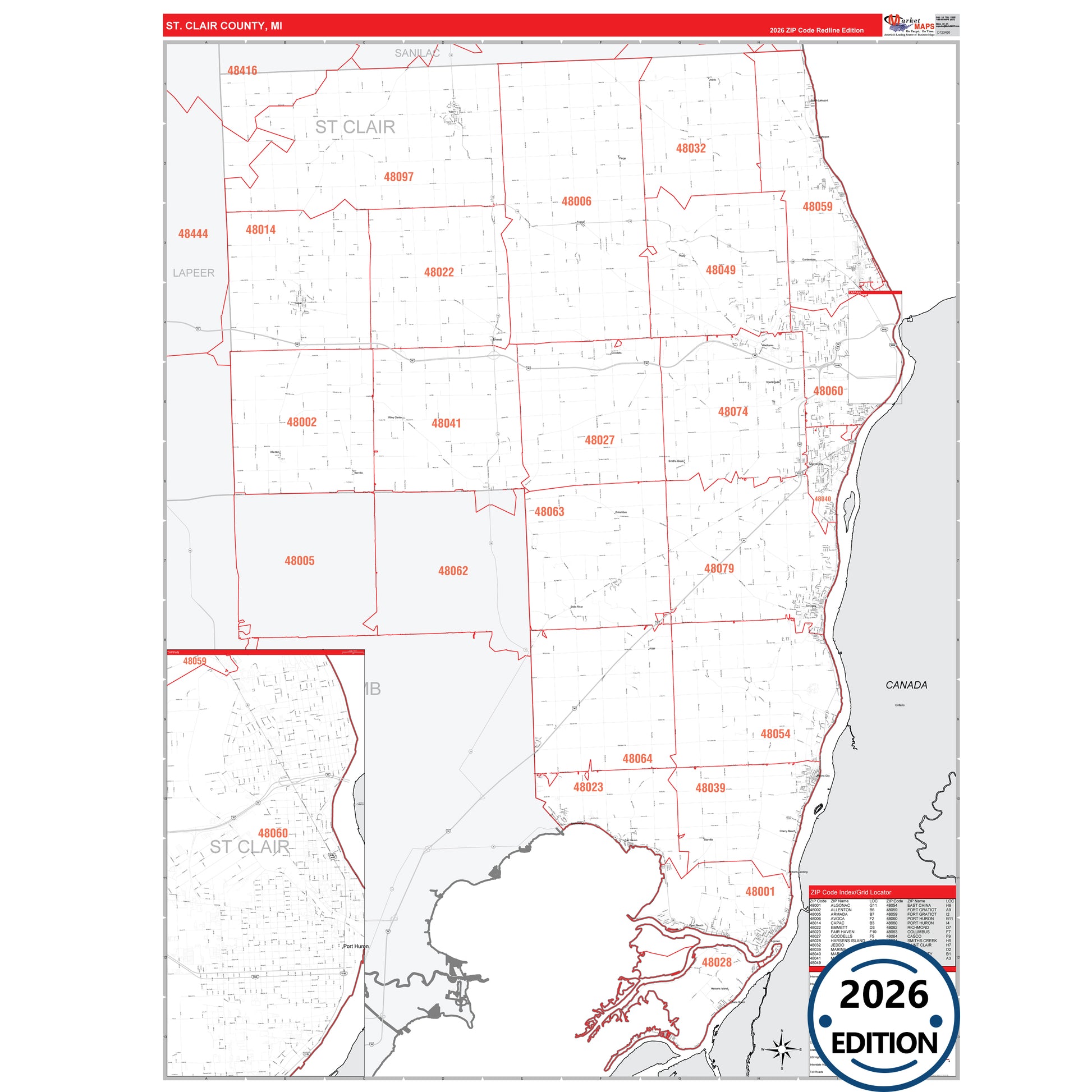 The RedLine Style map of St. Clair County, MI shows ZIP code areas overlaid on a detailed road network of St. Clair County, Michigan. Ideal for drawing locations, territories, and other applications. Base map features include all major streets and highways labeled, cities and towns, county and state boundaries, neighborhood names, railroads, and a clean white background suitable for marking and planning.