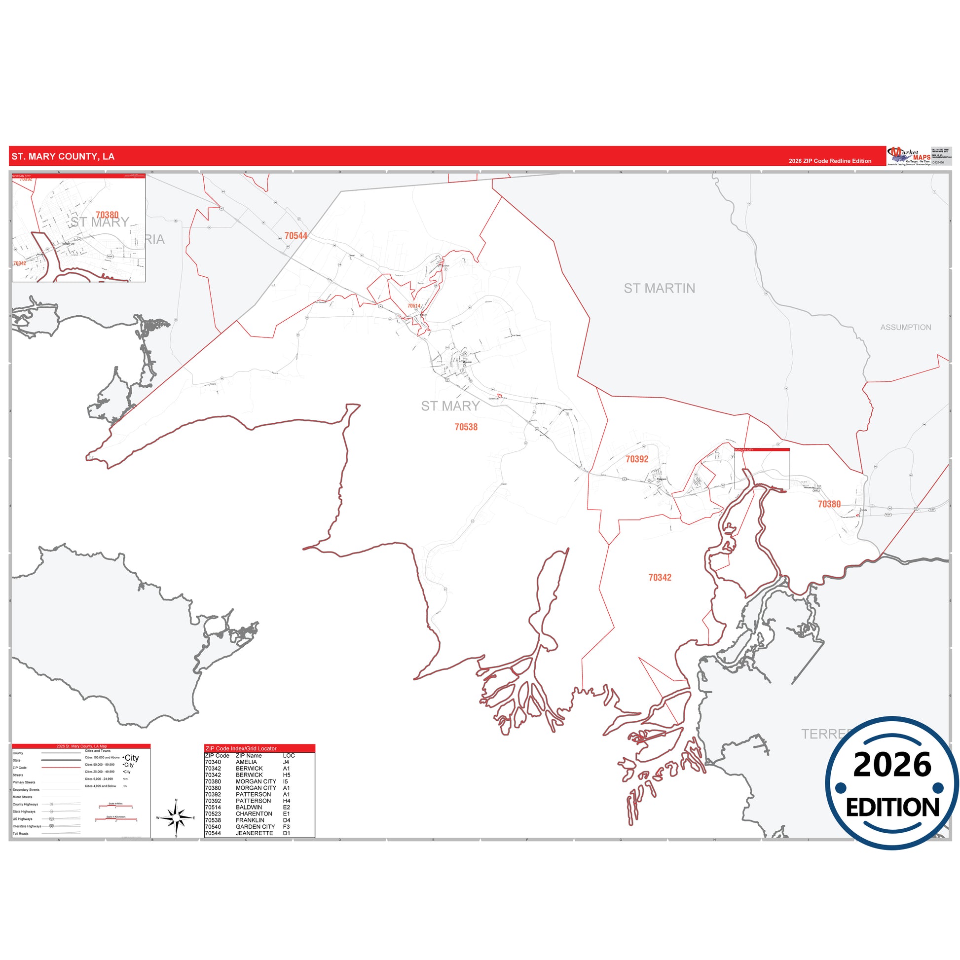 The RedLine Style map of St. Mary County, LA shows ZIP code areas overlaid on a detailed road network of St. Mary County, Louisiana. Ideal for drawing locations, territories, and other applications. Base map features include all major streets and highways labeled, cities and towns, county and state boundaries, neighborhood names, railroads, and a clean white background suitable for marking and planning.