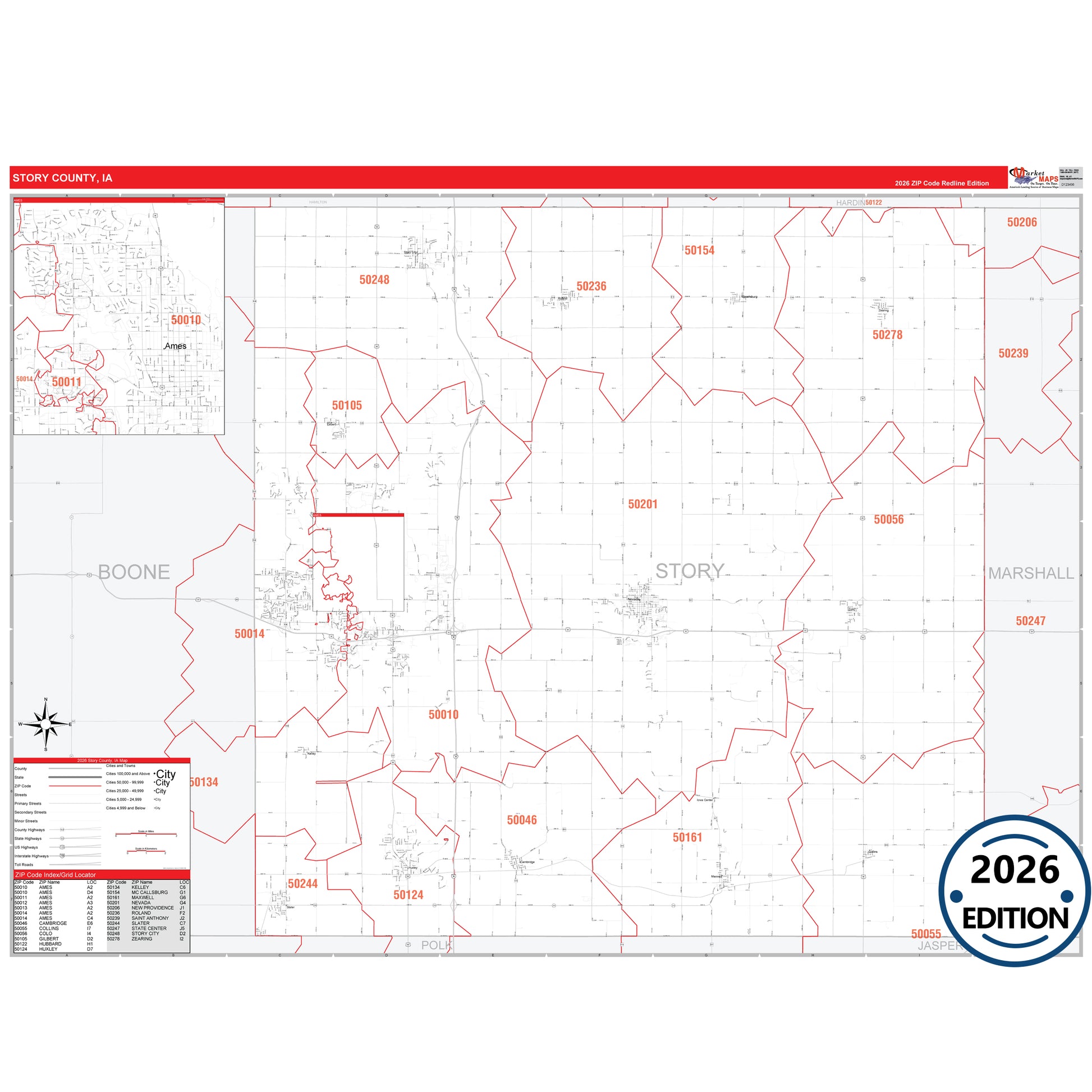 The RedLine Style map of Tama County, IA shows ZIP code areas overlaid on a detailed road network of Tama County, Iowa. Ideal for drawing locations, territories, and other applications. Base map features include all major streets and highways labeled, cities and towns, county and state boundaries, neighborhood names, railroads, and a clean white background suitable for marking and planning.