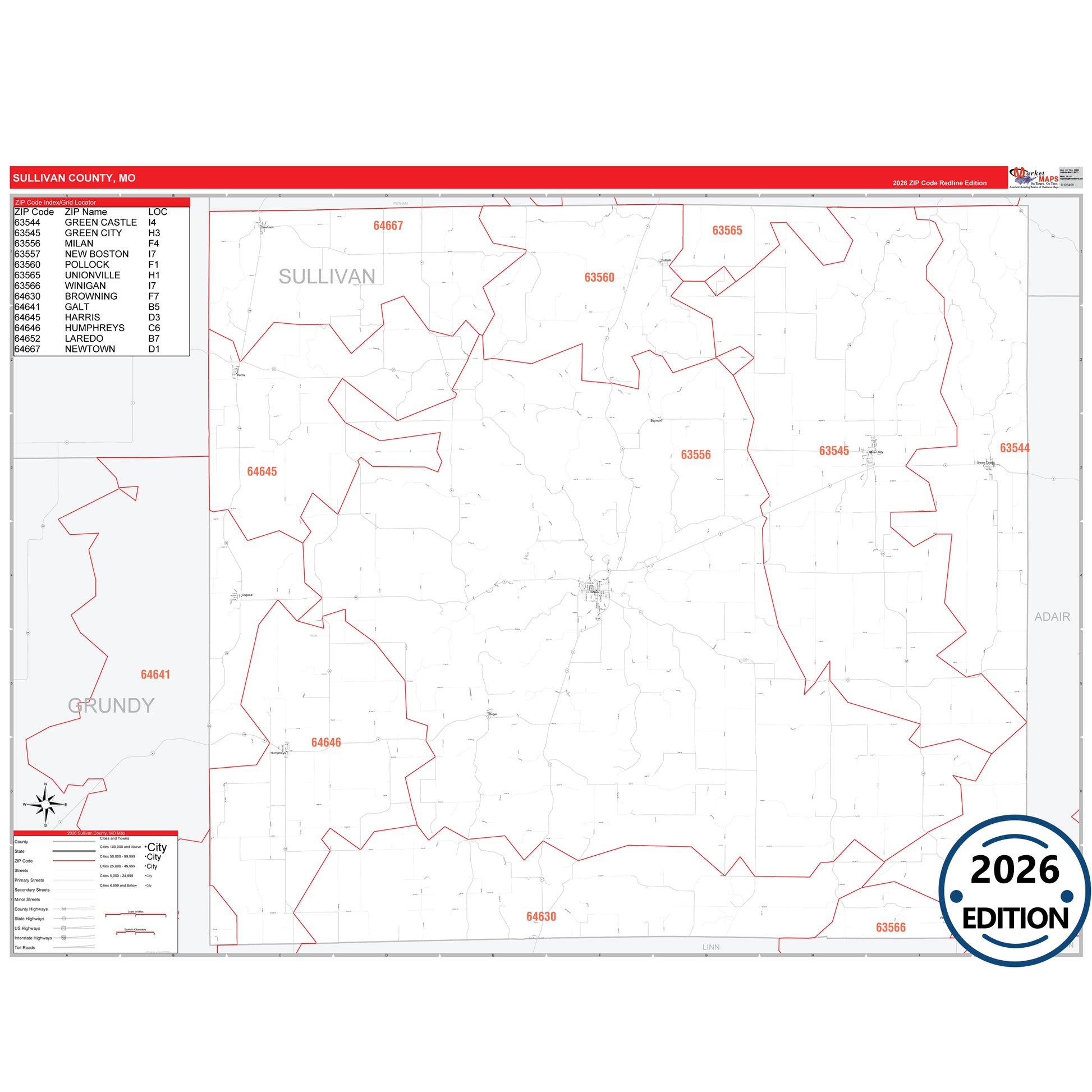 The RedLine Style map of Sullivan County, MO shows ZIP code areas overlaid on a detailed road network of Sullivan County, Missouri. Ideal for drawing locations, territories, and other applications. Base map features include all major streets and highways labeled, cities and towns, county and state boundaries, neighborhood names, railroads, and a clean white background suitable for marking and planning.