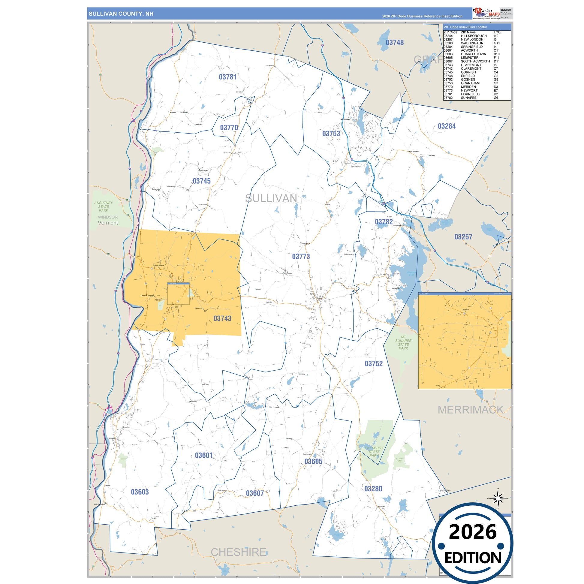 The Business Reference Style Sullivan County, NH is a detailed map that includes all towns, cities, major roadways, and highways. Available in multiple wall map sizes, perfect for home, school, office, or business display.
