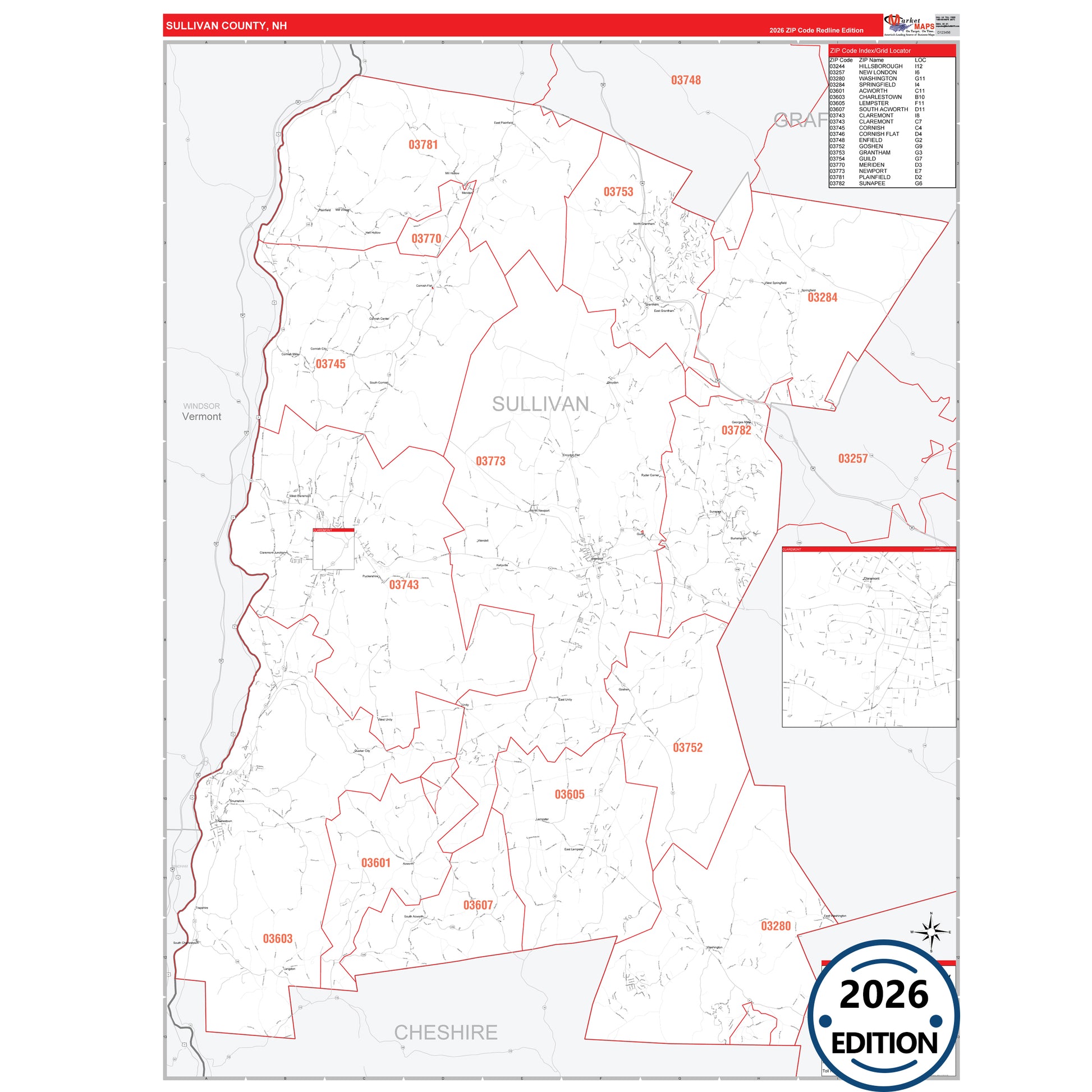 The RedLine Style map of Sullivan County, NH shows ZIP code areas overlaid on a detailed road network of Sullivan County, New Hampshire. Ideal for drawing locations, territories, and other applications. Base map features include all major streets and highways labeled, cities and towns, county and state boundaries, neighborhood names, railroads, and a clean white background suitable for marking and planning.
