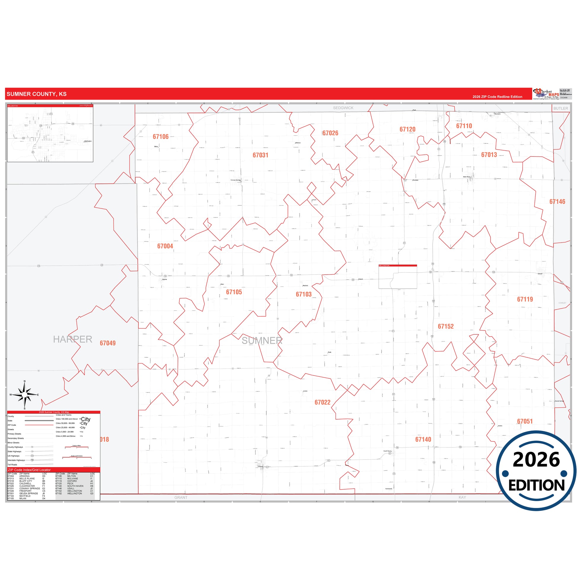The RedLine Style map of Sumner County, KS shows ZIP code areas overlaid on a detailed road network of Sumner County, Kansas. Ideal for drawing locations, territories, and other applications. Base map features include all major streets and highways labeled, cities and towns, county and state boundaries, neighborhood names, railroads, and a clean white background suitable for marking and planning.