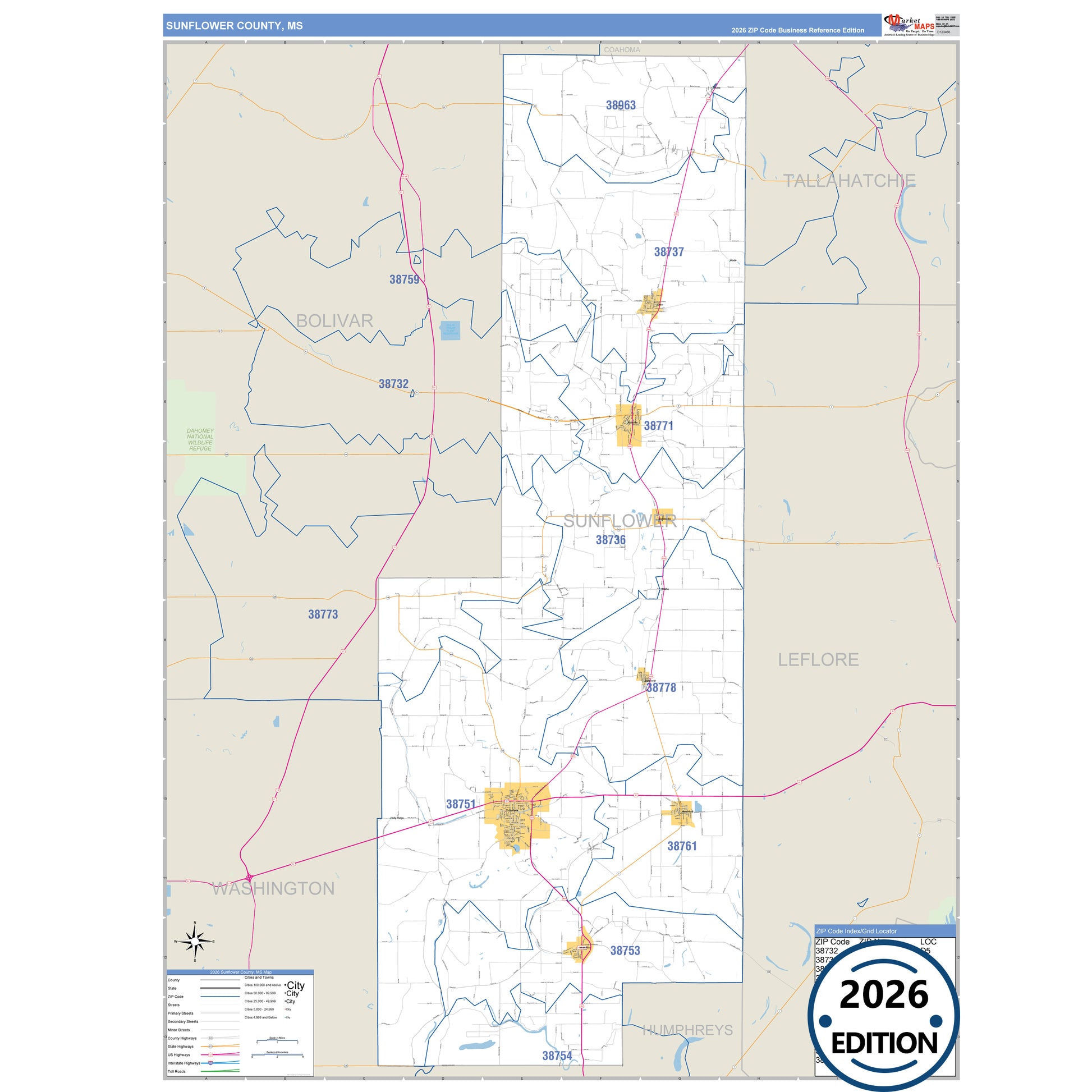The Business Reference Style Sunflower County, MS is a detailed map that includes all towns, cities, major roadways, and highways. Available in multiple wall map sizes, perfect for home, school, office, or business display.