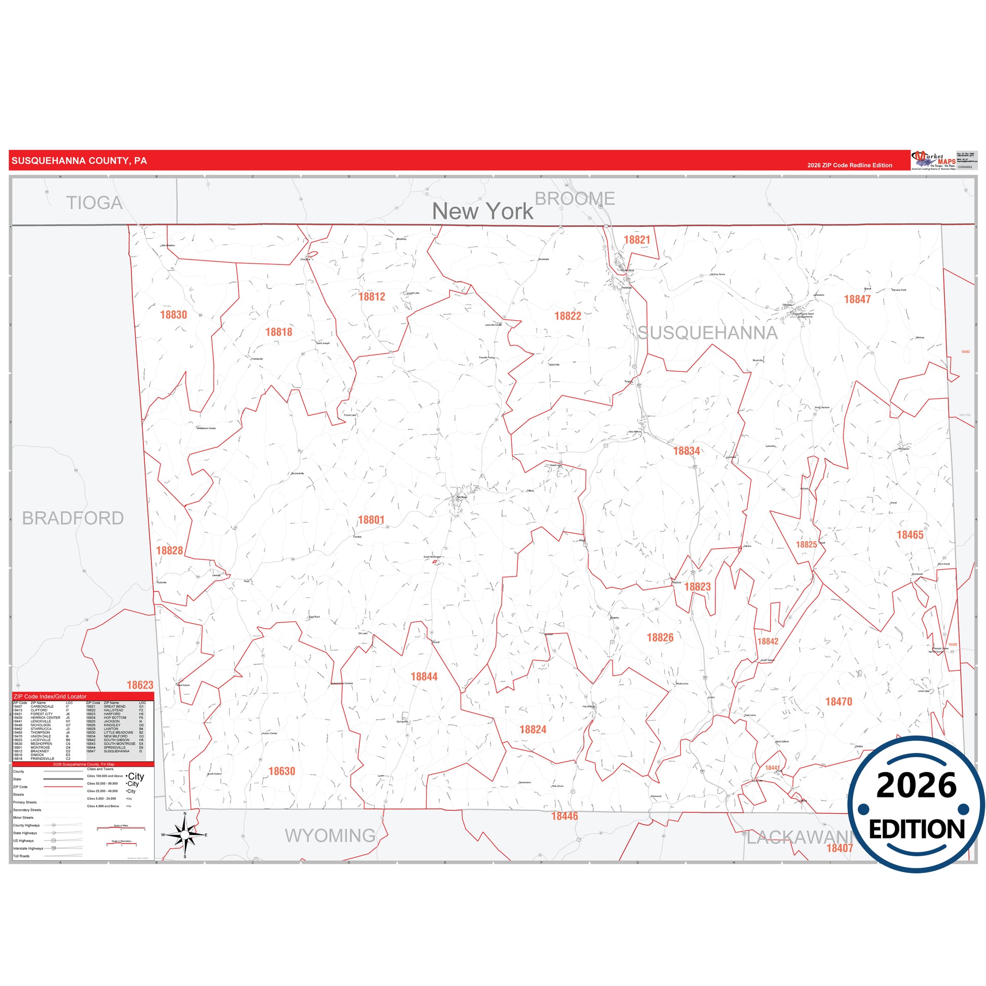 The RedLine Style map of Susquehanna County, PA shows ZIP code areas overlaid on a detailed road network of Susquehanna County, Pennsylvania. Ideal for drawing locations, territories, and other applications. Base map features include all major streets and highways labeled, cities and towns, county and state boundaries, neighborhood names, railroads, and a clean white background suitable for marking and planning.
