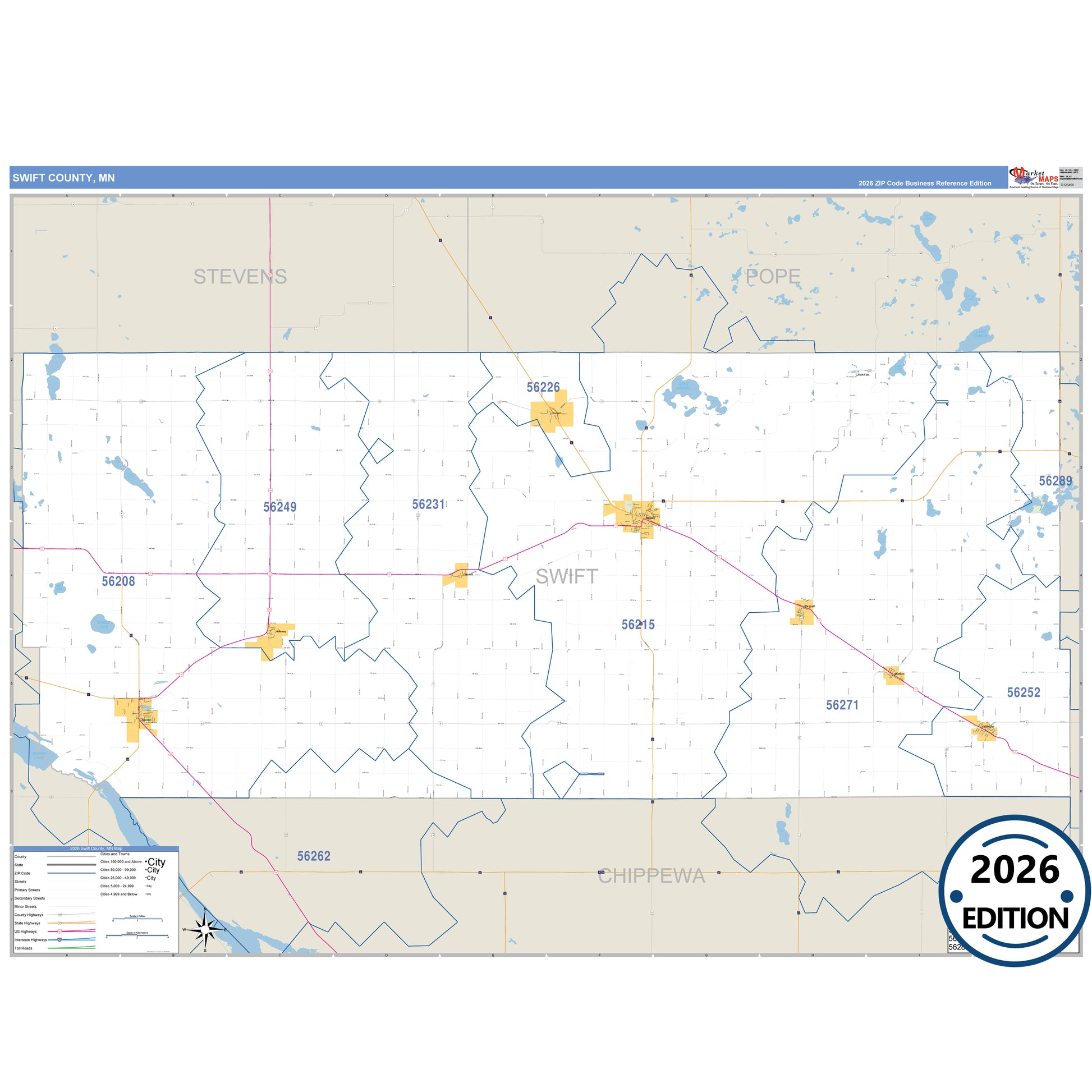 The Business Reference Style Swift County, MN is a detailed map that includes all towns, cities, major roadways, and highways. Available in multiple wall map sizes, perfect for home, school, office, or business display.