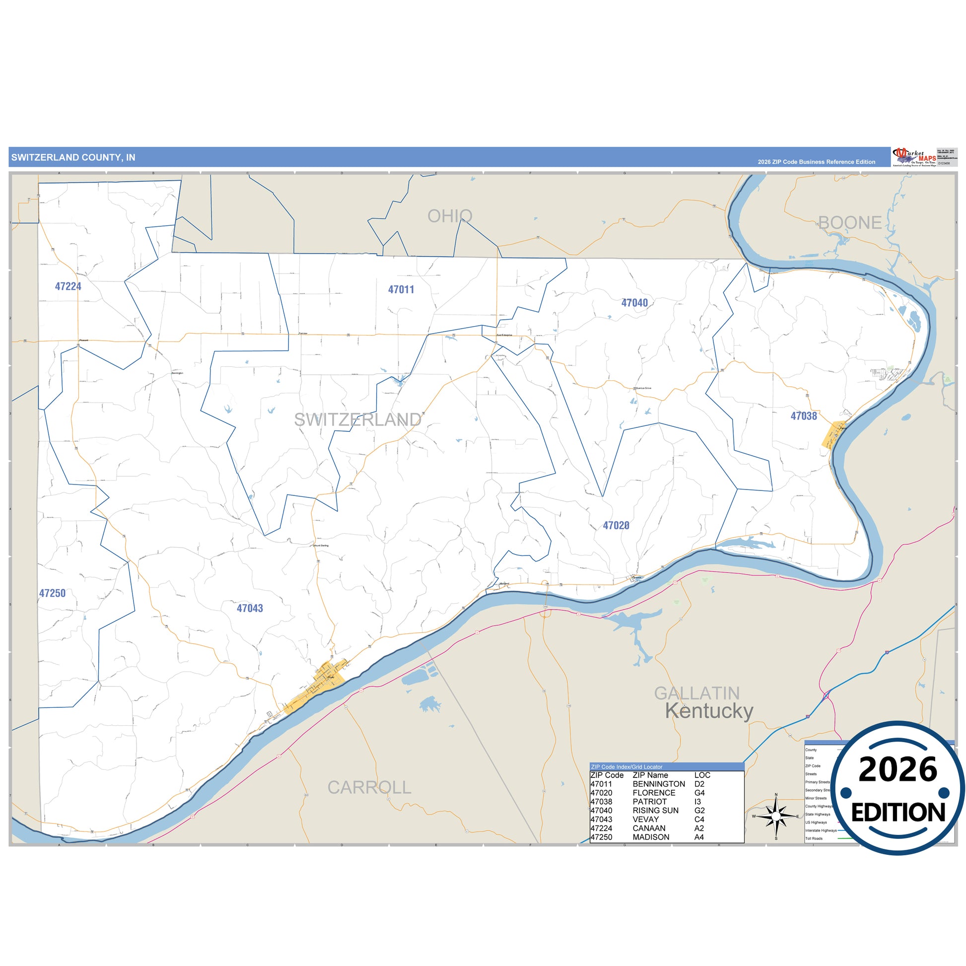 The Business Reference Style Switzerland County, IN is a detailed map that includes all towns, cities, major roadways, and highways. Available in multiple wall map sizes, perfect for home, school, office, or business display.