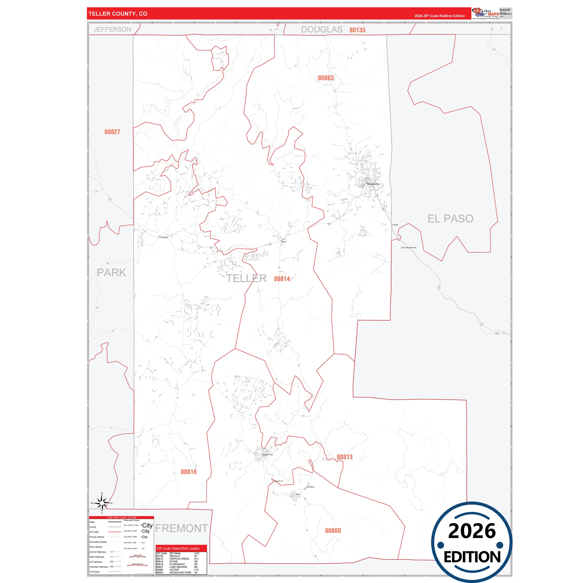 The RedLine Style map of Teller County, CO shows ZIP code areas overlaid on a detailed road network of Teller County, Colorado. Ideal for drawing locations, territories, and other applications. Base map features include all major streets and highways labeled, cities and towns, county and state boundaries, neighborhood names, railroads, and a clean white background suitable for marking and planning.