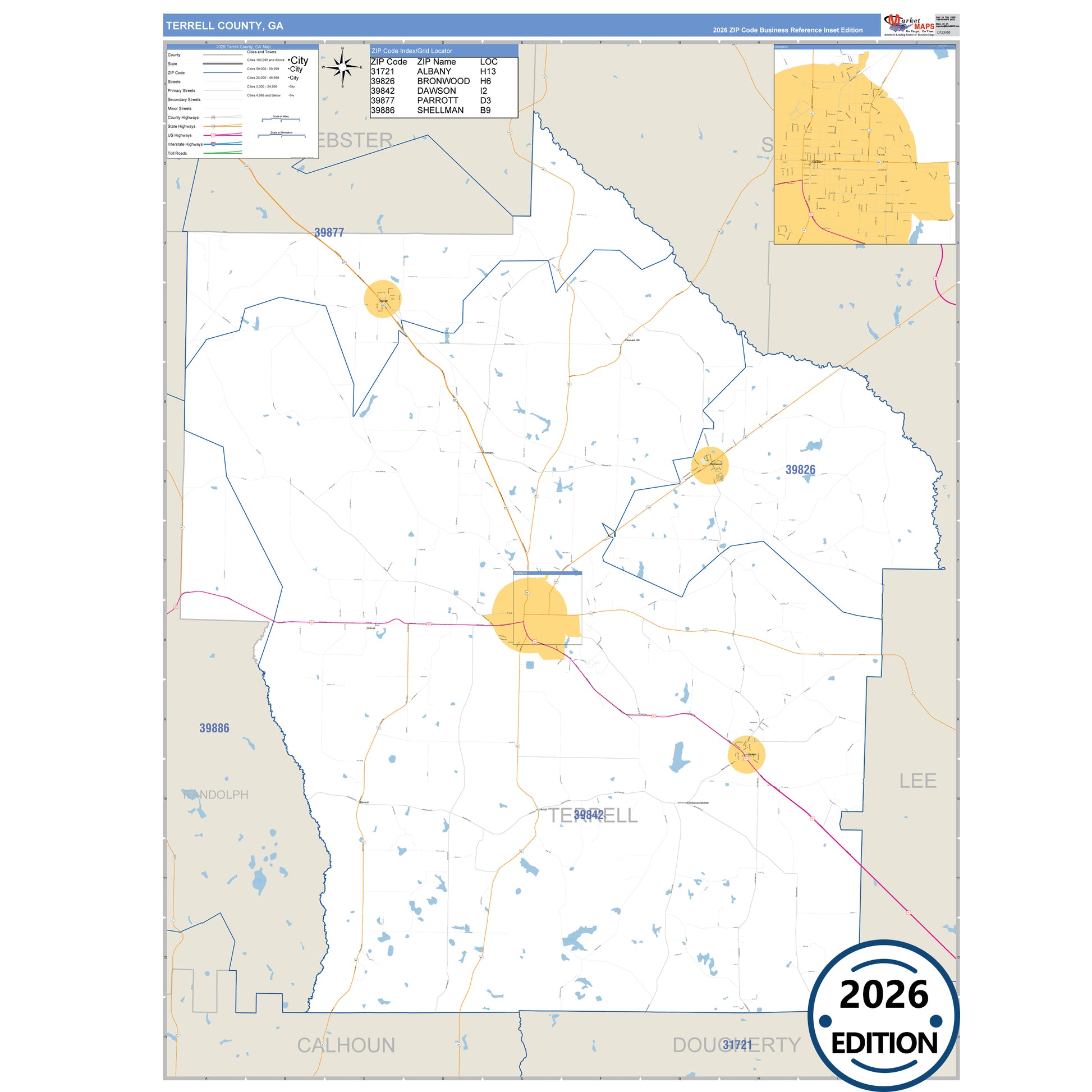 The Business Reference Style Terrell County, GA is a detailed map that includes all towns, cities, major roadways, and highways. Available in multiple wall map sizes, perfect for home, school, office, or business display.