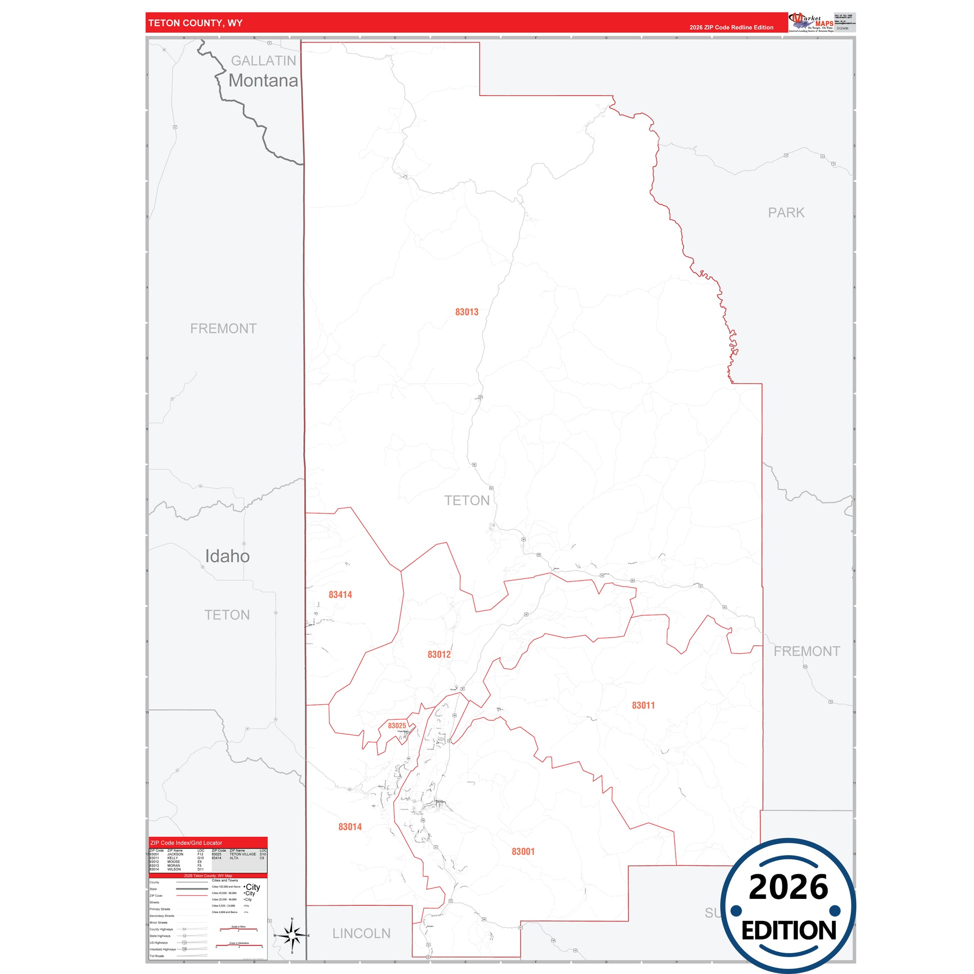 The RedLine Style map of Teton County, WY shows ZIP code areas overlaid on a detailed road network of Teton County, Wyoming. Ideal for drawing locations, territories, and other applications. Base map features include all major streets and highways labeled, cities and towns, county and state boundaries, neighborhood names, railroads, and a clean white background suitable for marking and planning.