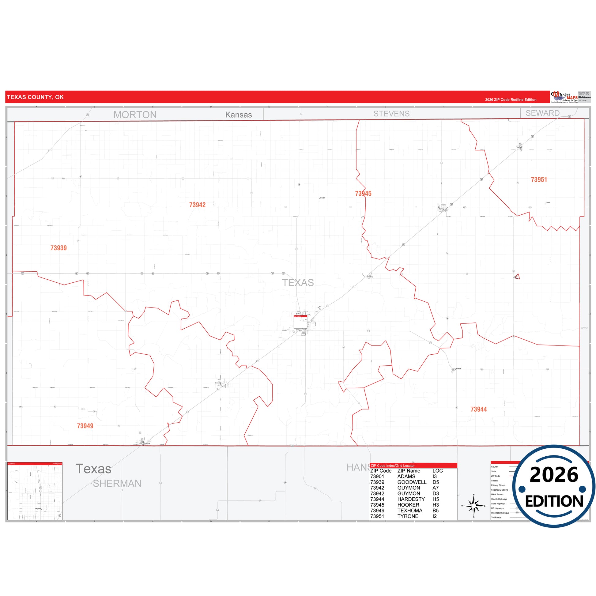 The RedLine Style map of Texas County, OK shows ZIP code areas overlaid on a detailed road network of Texas County, Oklahoma. Ideal for drawing locations, territories, and other applications. Base map features include all major streets and highways labeled, cities and towns, county and state boundaries, neighborhood names, railroads, and a clean white background suitable for marking and planning.