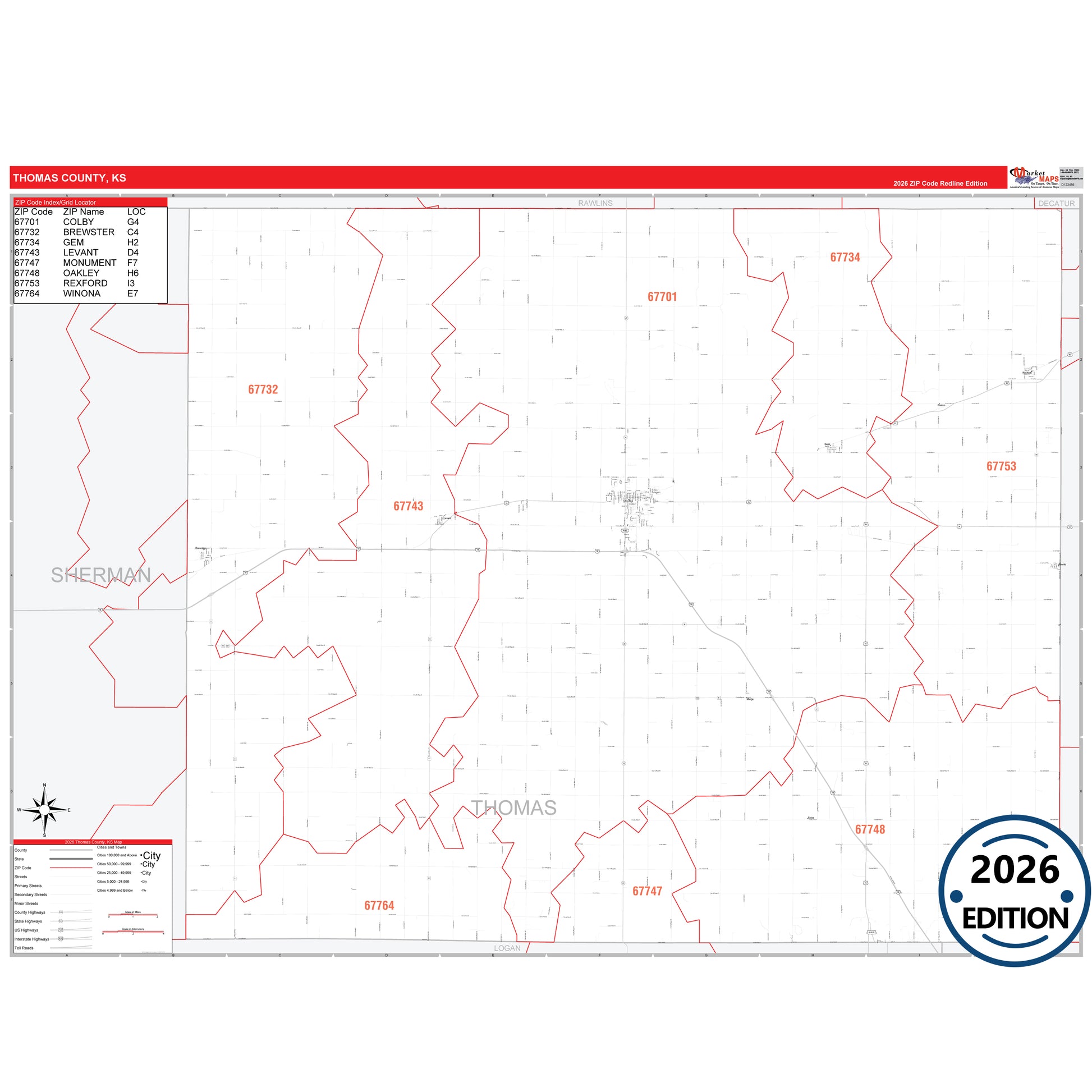 The RedLine Style map of Thomas County, KS shows ZIP code areas overlaid on a detailed road network of Thomas County, Kansas. Ideal for drawing locations, territories, and other applications. Base map features include all major streets and highways labeled, cities and towns, county and state boundaries, neighborhood names, railroads, and a clean white background suitable for marking and planning.