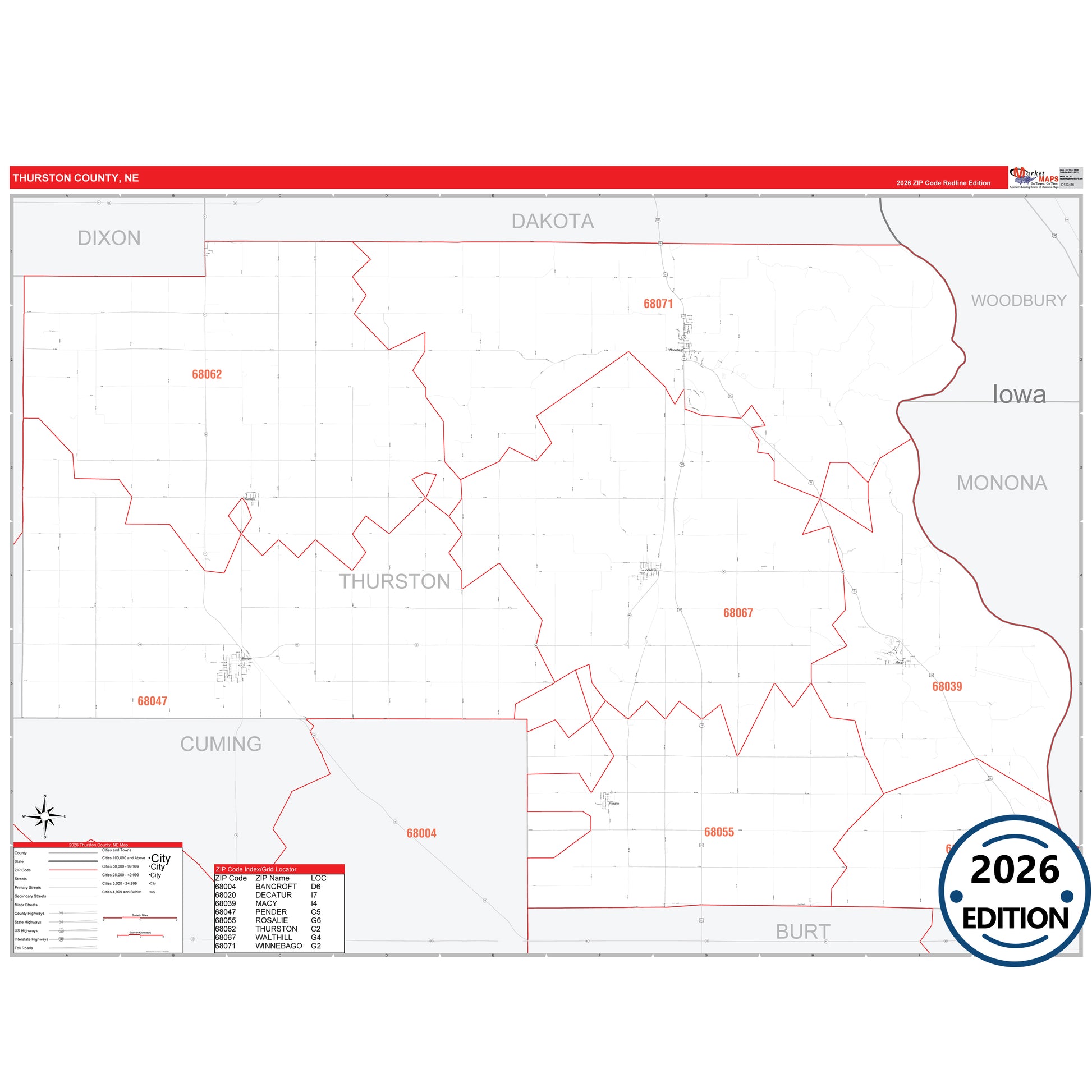 The RedLine Style map of Thurston County, NE shows ZIP code areas overlaid on a detailed road network of Thurston County, Nebraska. Ideal for drawing locations, territories, and other applications. Base map features include all major streets and highways labeled, cities and towns, county and state boundaries, neighborhood names, railroads, and a clean white background suitable for marking and planning.