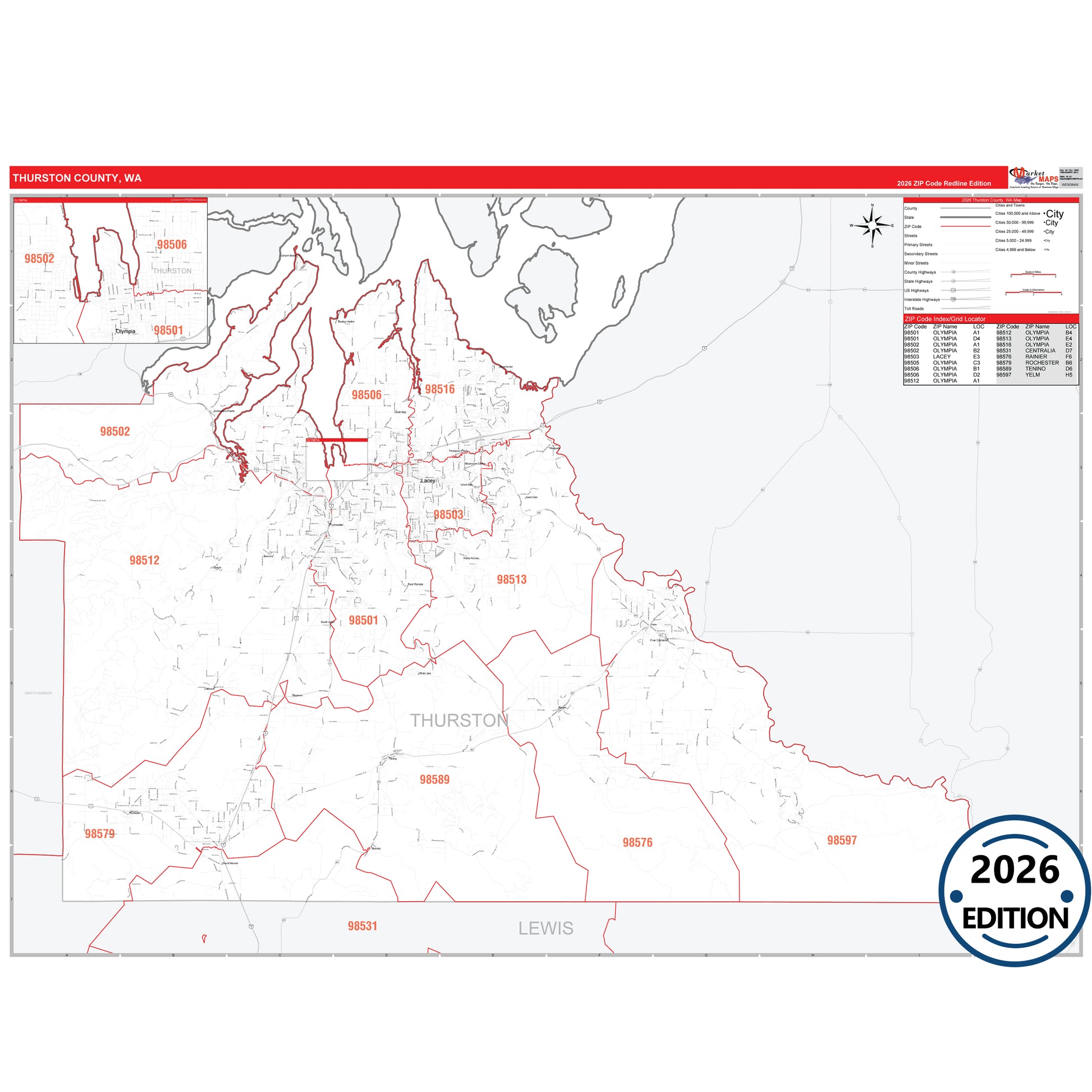The RedLine Style map of Thurston County, WA shows ZIP code areas overlaid on a detailed road network of Thurston County, Washington. Ideal for drawing locations, territories, and other applications. Base map features include all major streets and highways labeled, cities and towns, county and state boundaries, neighborhood names, railroads, and a clean white background suitable for marking and planning.