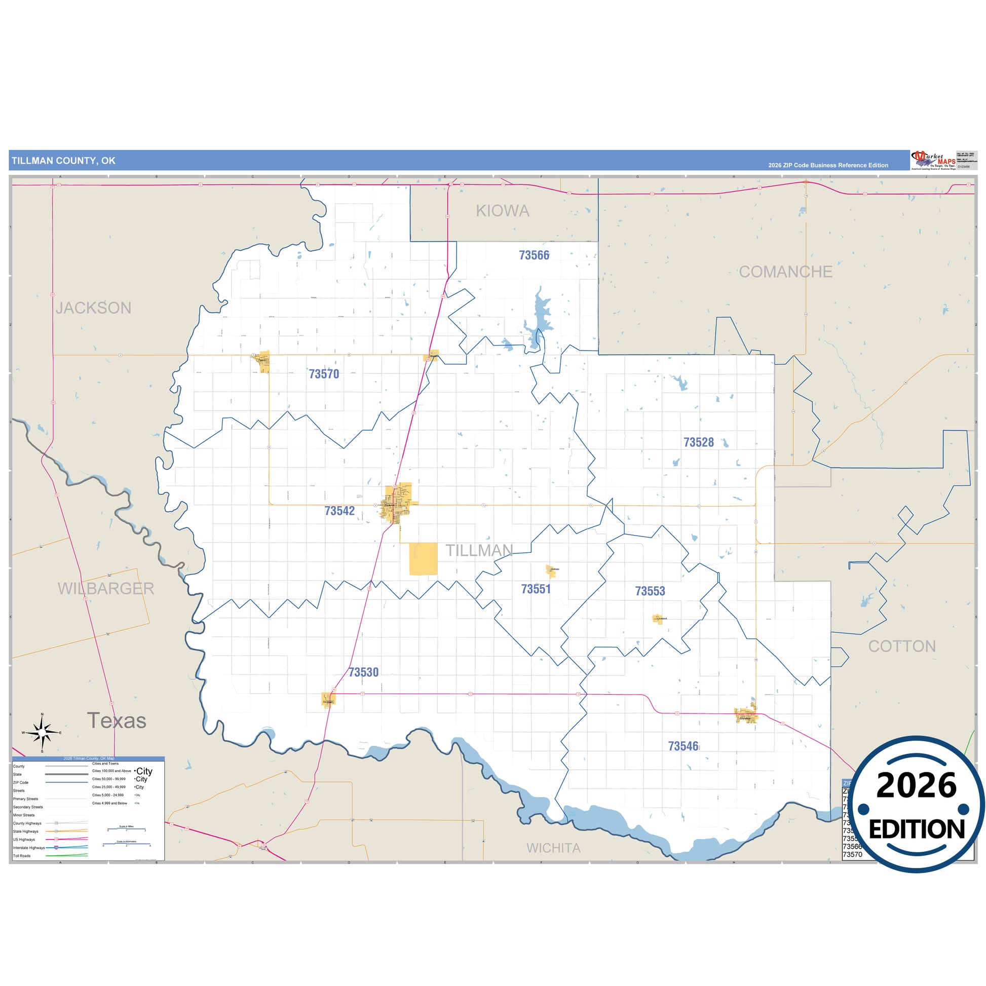The Business Reference Style Tillman County, OK is a detailed map that includes all towns, cities, major roadways, and highways. Available in multiple wall map sizes, perfect for home, school, office, or business display.