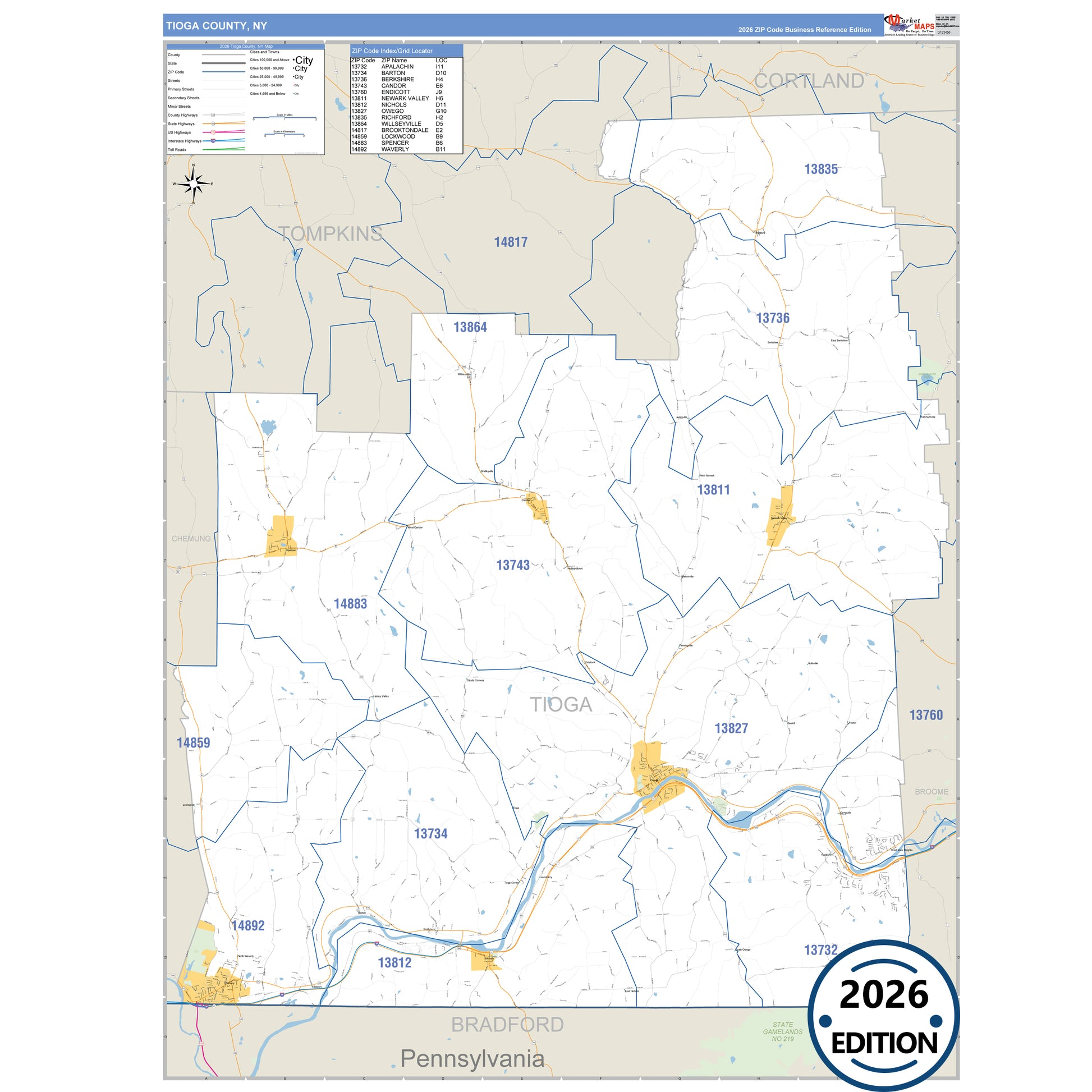 The Business Reference Style Tioga County, NY is a detailed map that includes all towns, cities, major roadways, and highways. Available in multiple wall map sizes, perfect for home, school, office, or business display.