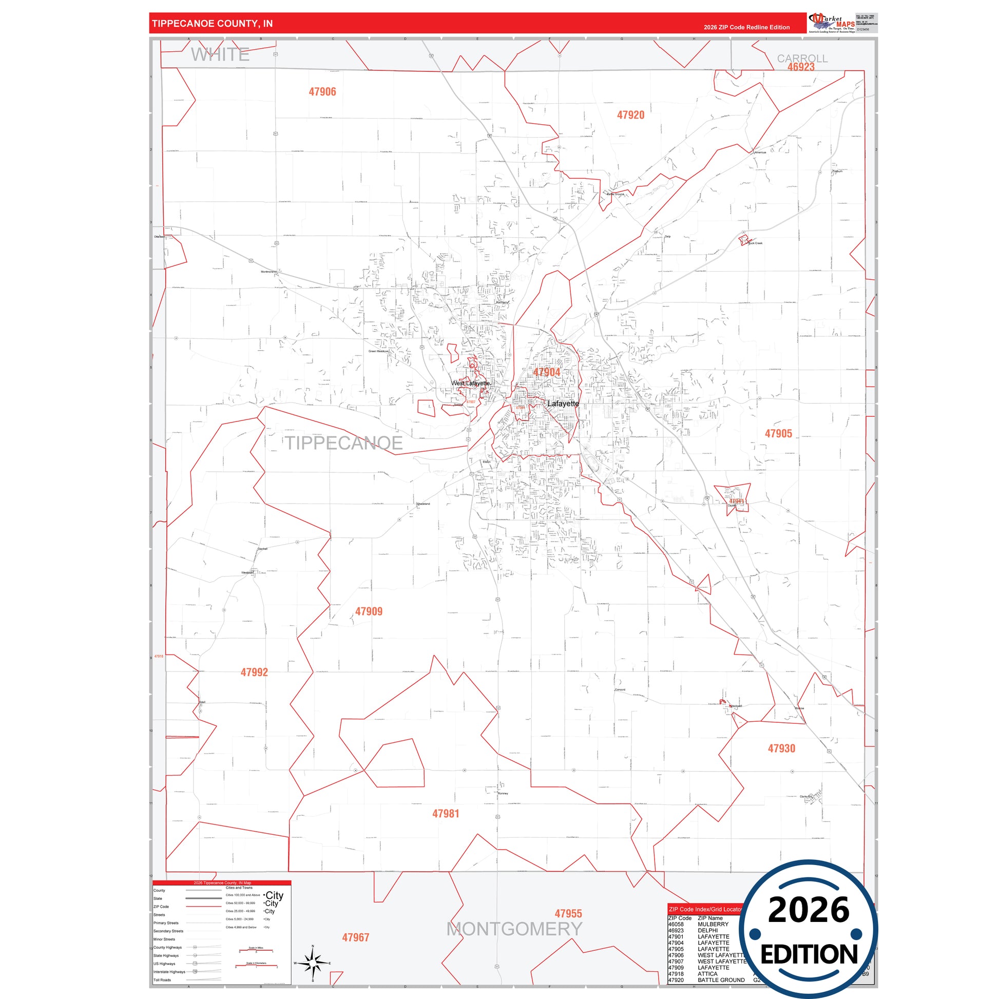 The RedLine Style map of Tippecanoe County, IN shows ZIP code areas overlaid on a detailed road network of Tippecanoe County, Indiana. Ideal for drawing locations, territories, and other applications. Base map features include all major streets and highways labeled, cities and towns, county and state boundaries, neighborhood names, railroads, and a clean white background suitable for marking and planning.