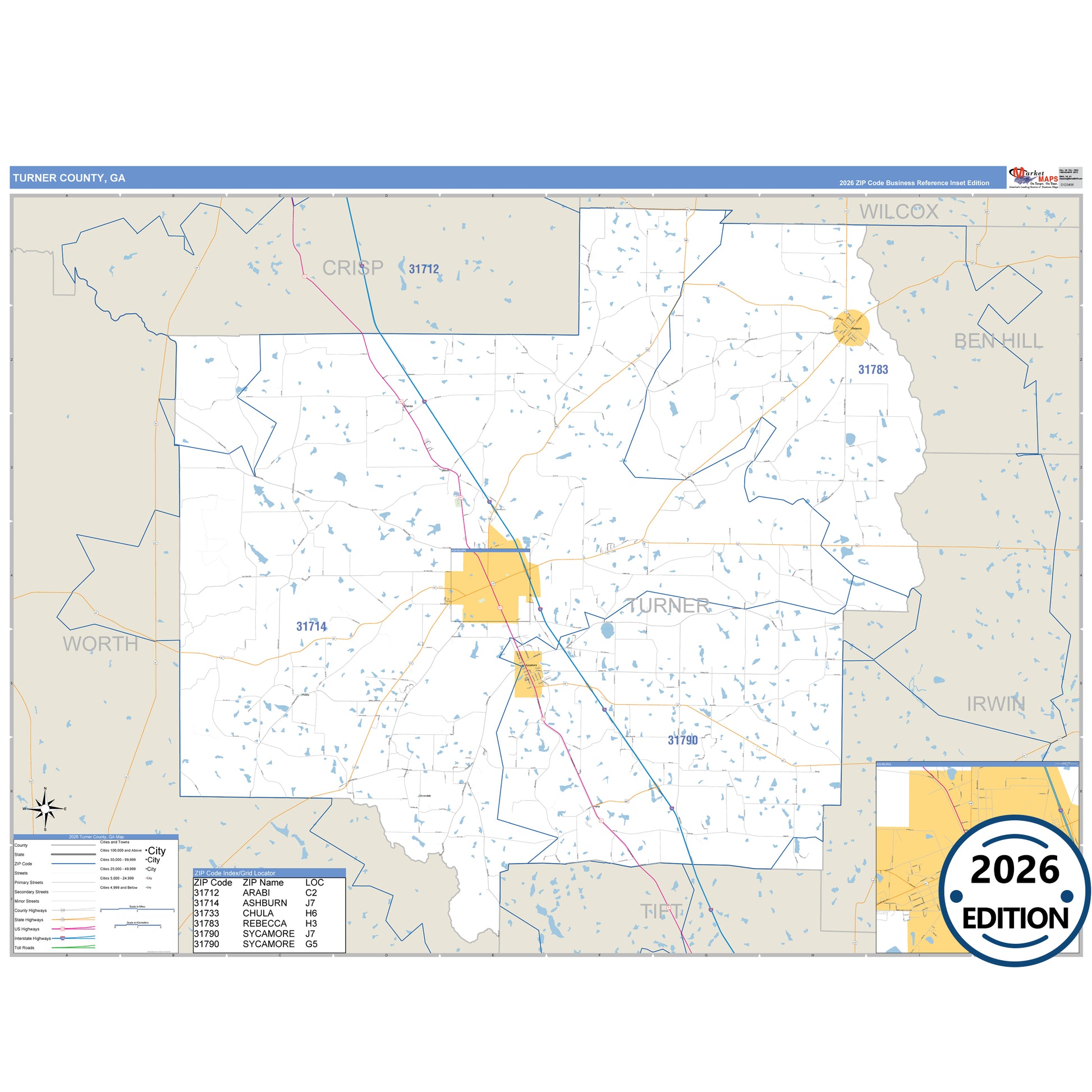 The Business Reference Style Turner County, GA is a detailed map that includes all towns, cities, major roadways, and highways. Available in multiple wall map sizes, perfect for home, school, office, or business display.