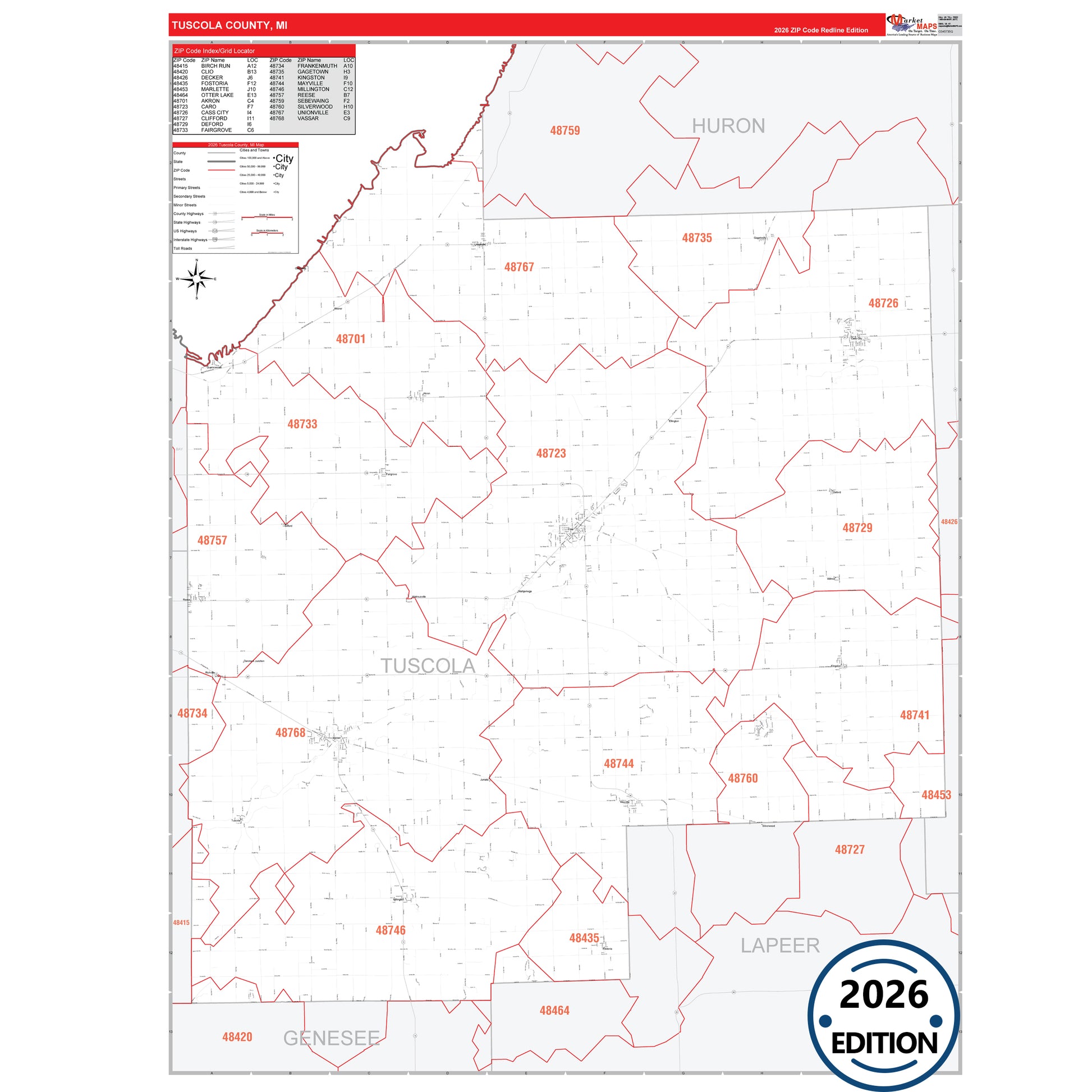 The RedLine Style map of Tuscola County, MI shows ZIP code areas overlaid on a detailed road network of Tuscola County, Michigan. Ideal for drawing locations, territories, and other applications. Base map features include all major streets and highways labeled, cities and towns, county and state boundaries, neighborhood names, railroads, and a clean white background suitable for marking and planning.