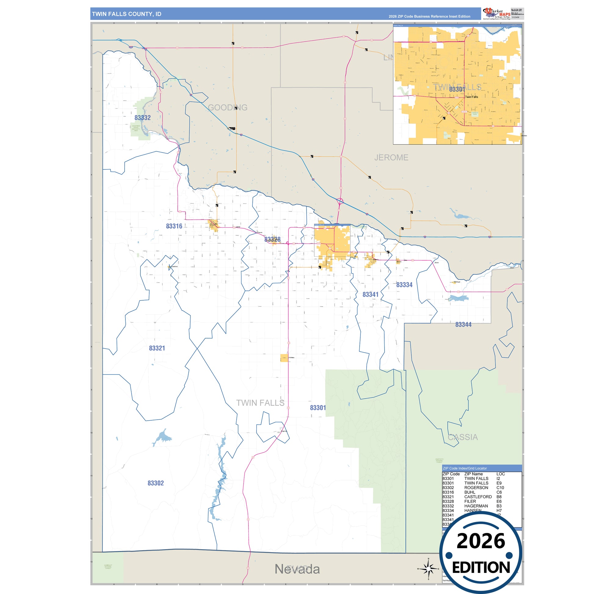 The Business Reference Style Twin Falls County, ID is a detailed map that includes all towns, cities, major roadways, and highways. Available in multiple wall map sizes, perfect for home, school, office, or business display.