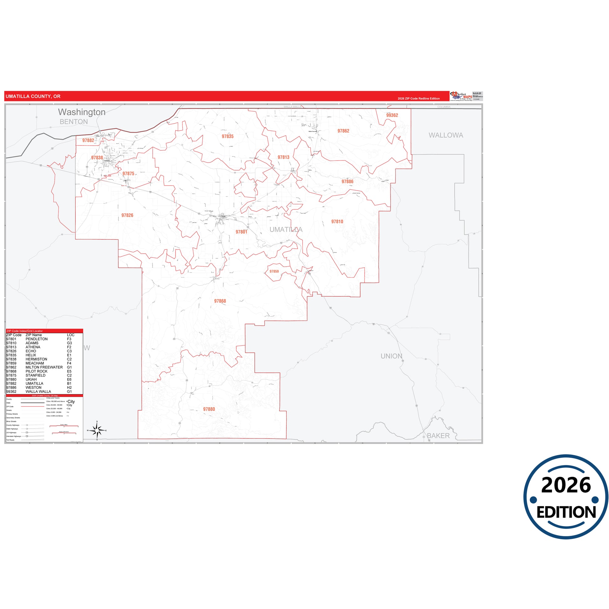 The RedLine Style map of Umatilla County, OR shows ZIP code areas overlaid on a detailed road network of Umatilla County, Oregon. Ideal for drawing locations, territories, and other applications. Base map features include all major streets and highways labeled, cities and towns, county and state boundaries, neighborhood names, railroads, and a clean white background suitable for marking and planning.