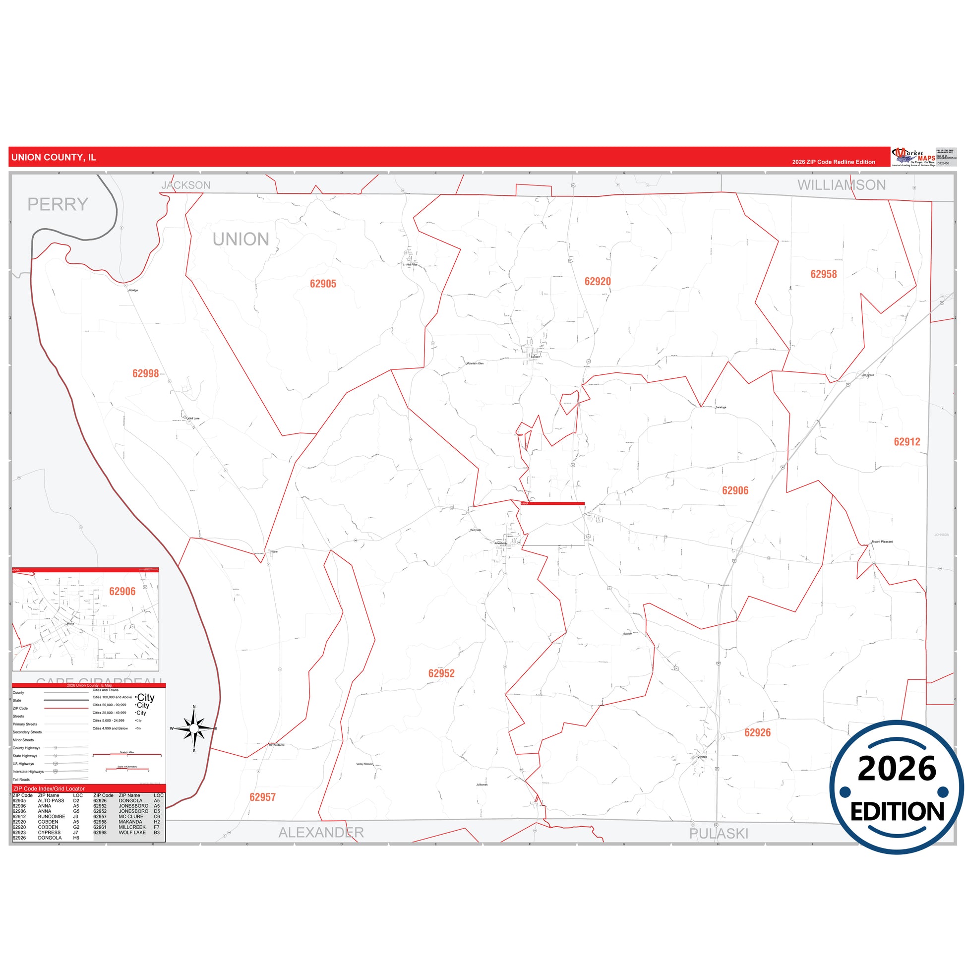 The RedLine Style map of Union County, IL shows ZIP code areas overlaid on a detailed road network of Union County, Illinois. Ideal for drawing locations, territories, and other applications. Base map features include all major streets and highways labeled, cities and towns, county and state boundaries, neighborhood names, railroads, and a clean white background suitable for marking and planning.