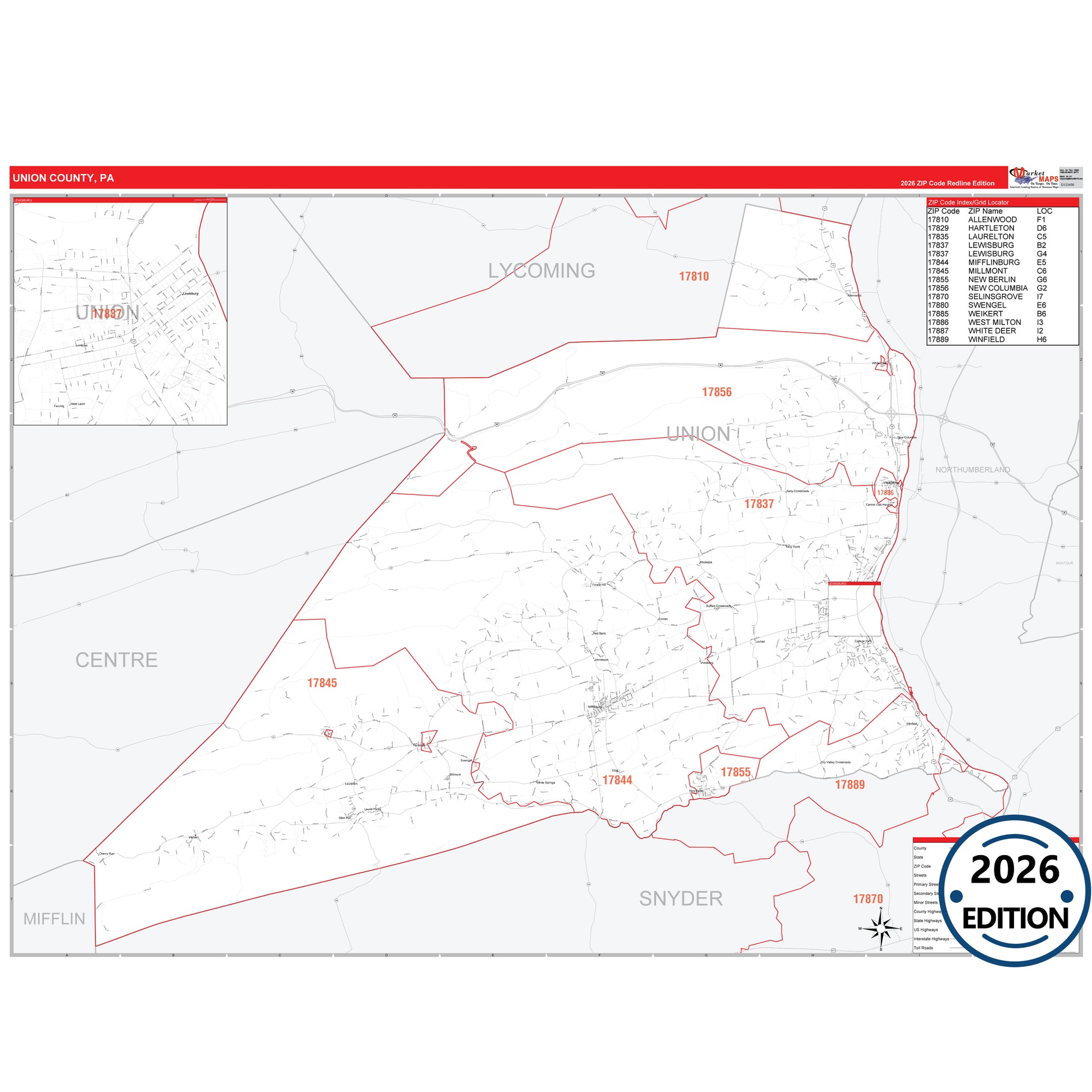 The RedLine Style map of Union County, PA shows ZIP code areas overlaid on a detailed road network of Union County, Pennsylvania. Ideal for drawing locations, territories, and other applications. Base map features include all major streets and highways labeled, cities and towns, county and state boundaries, neighborhood names, railroads, and a clean white background suitable for marking and planning.