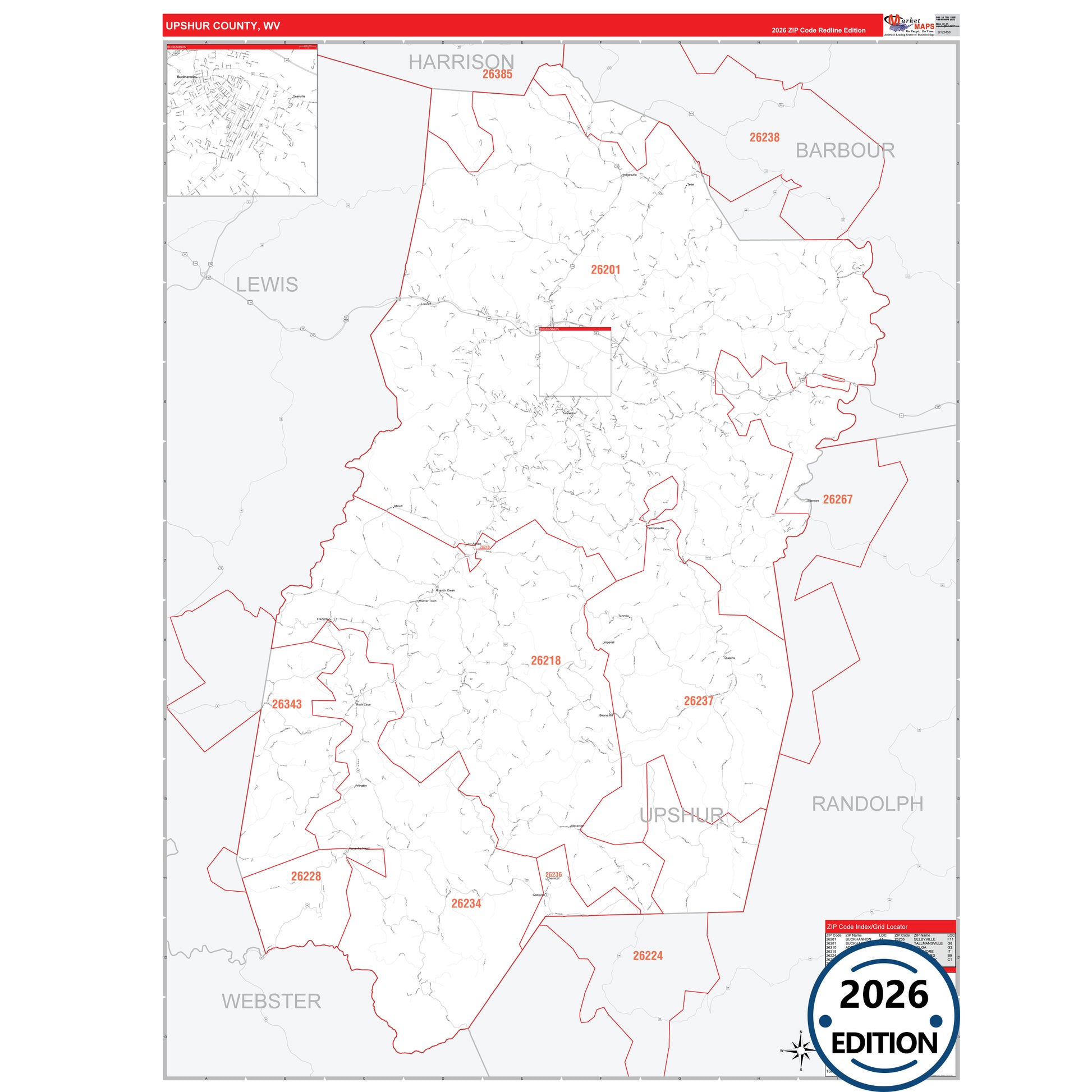 The RedLine Style map of Upshur County, WV shows ZIP code areas overlaid on a detailed road network of Upshur County, West Virginia. Ideal for drawing locations, territories, and other applications. Base map features include all major streets and highways labeled, cities and towns, county and state boundaries, neighborhood names, railroads, and a clean white background suitable for marking and planning.